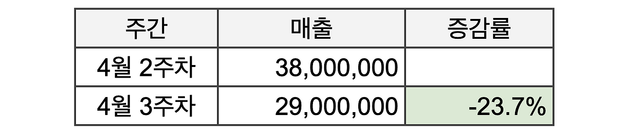 '기저 효과(基底效果)'는 기준 시점에 따라 지표가 실제보다 위축되거나 부풀려 보이는 현상을 의미합니다. 예를 들어, 회사에서 늘 전주 대비 매출 증감률을 트래킹하고 있다고 해볼게요. 그리고 이번주에 출근해서 지표를 보니 아래와 같은 상황입니다. 거의 24%나 하락했다니! 이 수치만 보고 놀라서 굉장한 위기 상황이라고 생각할 수도 있을 텐데요. 하지만 만약 공교롭게도 전주가 대규모 세일 주간이었다면, 이번주의 매출이 큰 폭으로 하락한 것처럼 보이지만 사실은 아무런 문제가 없는 상황일 수도 있습니다.