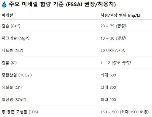 인도의 경우, 우리나라 식약처에 해당하는 FSSAI(Food Safety and Standards Authority of India)에서 생수의 미네랄 함량 기준을 정하고 관리합니다. FSSAI 기준을 참고하시기 바랍니다.