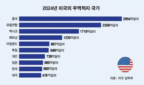 미국 상무부와 무역대표부(USTR) 통계에 따르면, 2024년 미국의 상품 무역적자 규모는 약 9,180억 달러로 집계되었습니다. 주요 적자국은 다음과 같습니다.