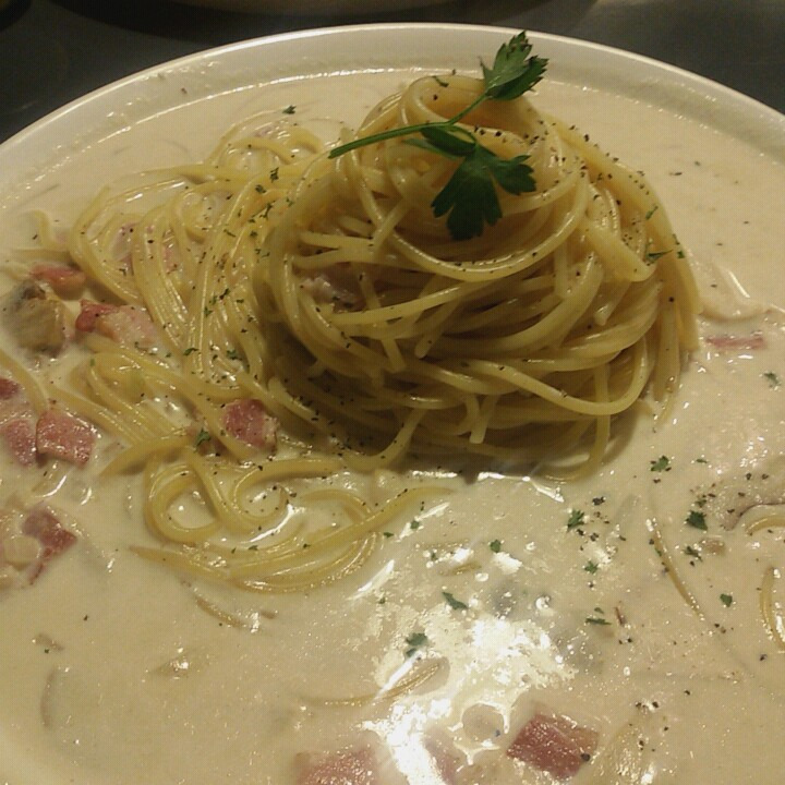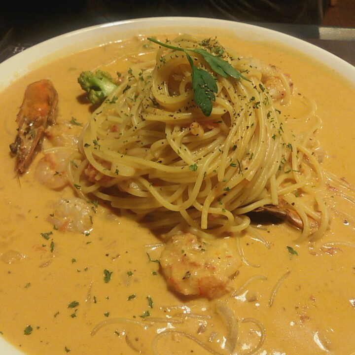 목살 샐러드를 하나 파스타를 하나 주문할까 하다가 점심때 샐러드를 이미 먹었기에, 그리고 한참 열심히 먹으러 다녔던 샐러드에 요즘 질려가고 있었기에 1.5인분의 양이라는 사실을 알면서도 파스타를 인당 하나씩 주문, 1.5인분의 양이라는 걸 알고 있었음에도 엄청나게 큰 접시에 담겨 등장하는 파스타에 둘 다 탄성 연발!
