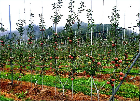사과나무는 작업 편의성과 일조량 확보가 중요하다. 그래서 조성된 시설에서 일정한 모양으로 재배하는 경우가 많다. 지구온난화로 사과 주산지가 고랭지나 북쪽으로 성큼 이동했다. 사과는 비교적 서늘한 기후를 선호하기 때문이다.
