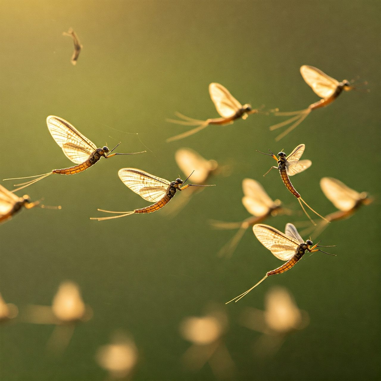성충 하루살이는 짝짓기에만 온 힘을 쏟는다. 먹이도 못 먹고 종족 번식에만 집중하는 기막힌 운명이다. 입이 퇴화하여 사라졌기 때문이다. 그들은 하루치의 비상식량으로 버티며 떼 지어 날아다닌다. 그렇게 공중에서 짝짓기하고 수컷은 바로 숭고한 최후를 맞는다. 암컷은 물에서 산란하고 물고기 밥이 된다. 짝짓기 못 한 개체들은 며칠 내로 굶어 죽는다. 인간의 시각에서 보면 모든 게 비극적인 종말이다.