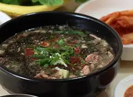 나를 흘겨보던 할머니가 조금 있다가 뚝배기 하나를 내밀었다. 그 속에는 퍼런 해초로 가득한 허연 국이 가득 담겨 있었다. 언뜻 돼지고기 육수 냄새가 나는 거 같기도 하고. 도대체 이게 뭔가 싶지만, 일단 한 숟갈 넘긴 순간.