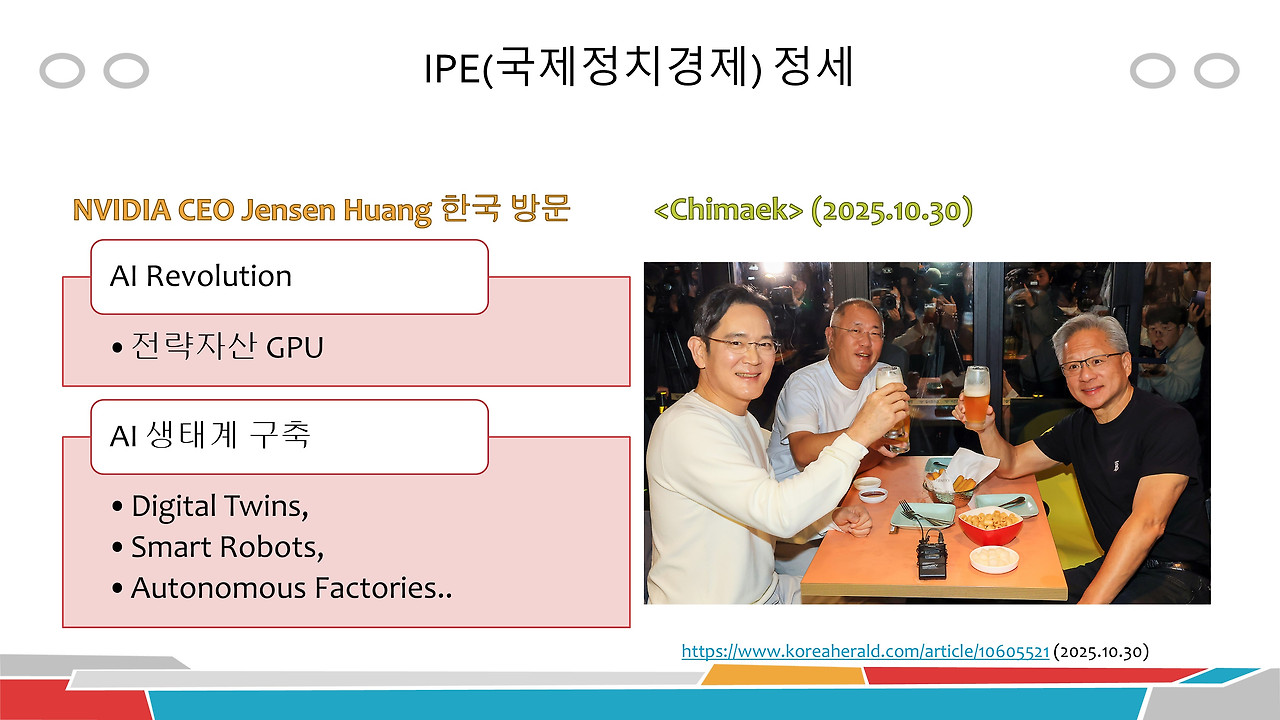 치맥도 먹어봐야겠지만.. 모든 것의 핵심에는 <AI 생태계 구축>을 위한 연합과 전략 동맹을 맺는 것과 맞물려 있음도 알아야겠죠. Chip 설계에서부터 Digital Twins, Smart Robots, Autonomous Factories 등으로 이어지죠.