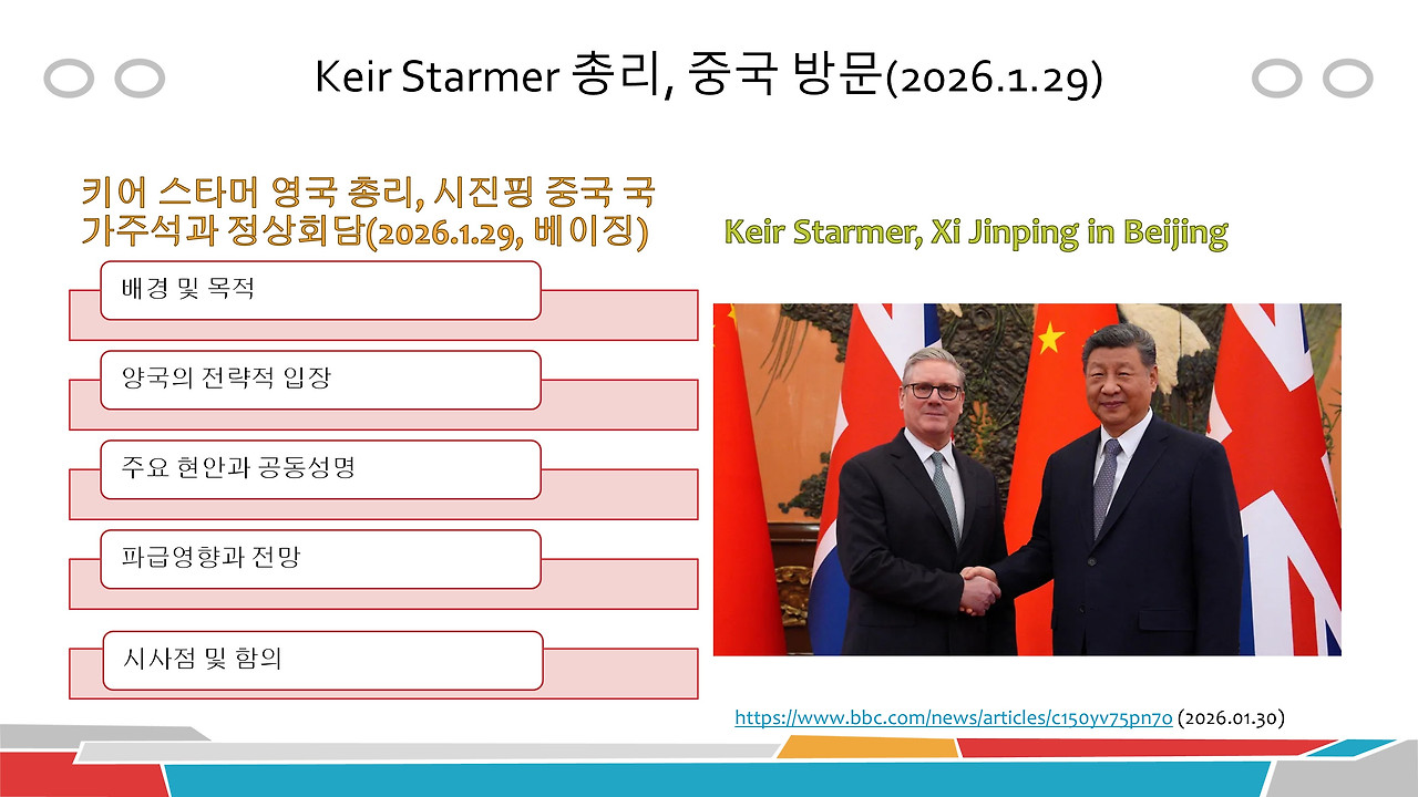 2026년 1월 29일(목) 키어 스타머(Keir Starmer) 영국 총리가 중국을 방문해 시진핑 국가주석과 정상회담을 가졌습니다. 무엇을 얘기했고, 어떤 국제정치적 함의가 있는지 탐구해 봅니다.