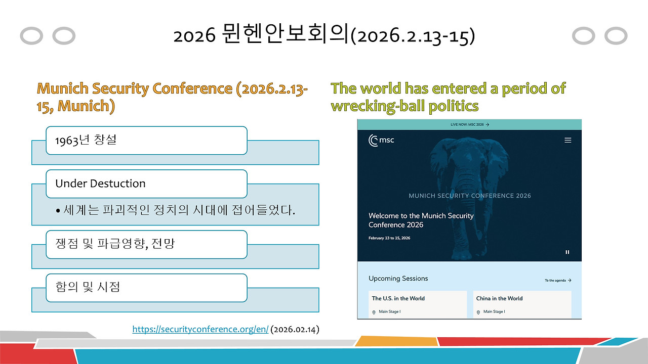 2026년 2월 13일(금) 독일 뮌헨에서 프리드리히 메르츠(Friedrich Merz) 독일 총리, 우르술라 폰 데어 라이엔( Ursula von der Leyen) 유럽연합(EU) 집행위원장 등이 참석한 가운데 뮌헨안보회의가 개최되었습니다. 이는 2월 15일까지 진행되며, 미국에서는 마코 루비오(Marco Rubio) 국무장관이 참석해 연설할 예정입니다.
