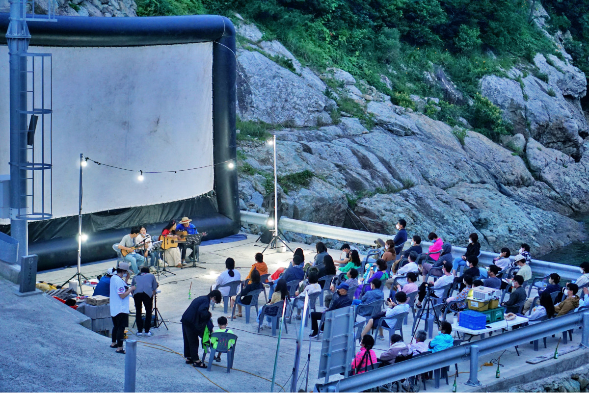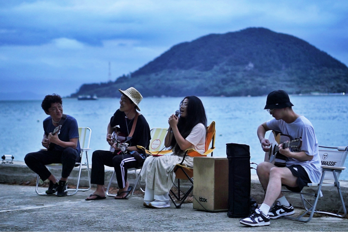 90분짜리 통영 올 로케 뮤직비디오의 느낌을 주는, 아름다운 통영 풍경과 밴드의 노래가 이어지는 이 영화의 분위기는 전반적으로 청량하고 따스하다. 그러나 동시에 첨예하다. 영화 말미, 밴드 공연장에 참석한 청년 관객은 말한다. “이렇게 많은 통영 사람들이 있다니!” 이 말은 각자의 이유로 통영에 살아가는 청년들의 네트워크가 취약함을 대변한다. 이들은 ‘고독하게’ 살아가고 있었던 것이다. 왜일까? 왜 이미 곁에서 살아가는 또 다른 지역 청년과 일상적으로 연결되지 못하고 특별한 계기를 통해서만 연결되는 걸까? 어쩌면 당연한 일인지도 모른다. ‘지역 소멸’이라는 무시무시한 말이 횡행하고, 청년들이 지역을 떠나 수도권으로 몰린다는 뉴스가 매일같이 쏟아진다. 필요한 분석이고, 일부 사실이기도 하다. 그러나 종종 함부로 유통되는 이런 말들은 지역에서 자기 삶을 살아가는 사람들을 위축시켜 움츠러들게 만들기도 한다. 자기 옆의 또 다른 청년에게 다가가 관계를 형성하는 대신 지역에서의 삶을 음울하게 되돌아보게끔 추동하는 것이다.