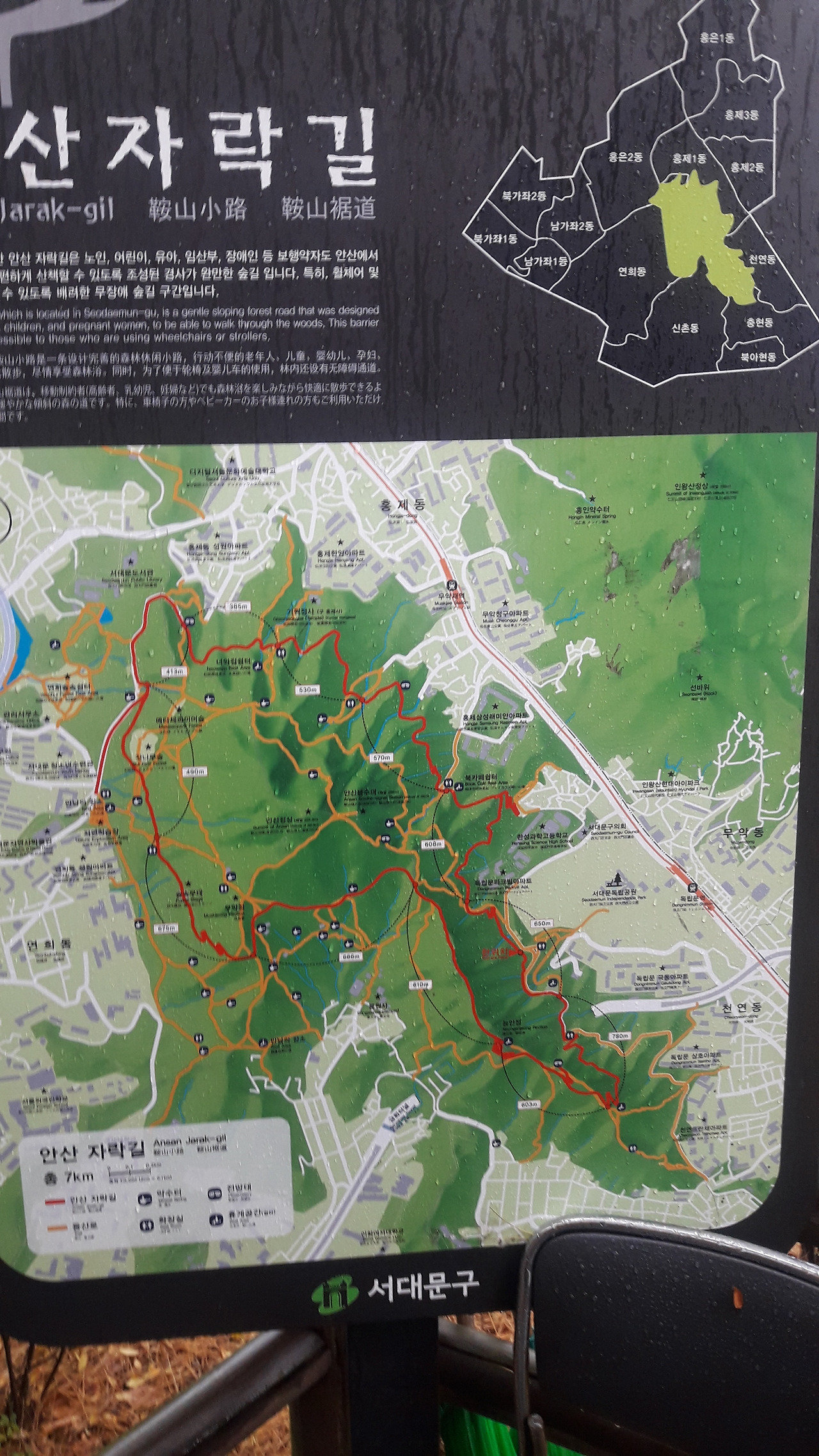 일주일에 한두 번 주말을 이용해 산책을 하는 사람에게는 어쩌다 한 번 오는 비로 산책을 쉬게 되면 아쉽기만 하다. 그래서 나는 비 오는 날에도 평소와 같이 산책하기 위해 준비해 놓은 곳이 있다. 바로 독립문역에서 내려 서대문독립공원 뒤로 오르면 있는 '안산자락길'이다. 이름만으로도 우리나라에 수많은 둘레길, 올레길 속에서도 단연 멋스러움이 느껴진다. 비 오는 날에는 안산을 산책하는 특별한 이유는 전체 코스에 경사가 없이 평평해 걷기에 미끄러짐이 없기 때문이다. 이런 산책로를 '무장애산책로'라고 부르는데 이것만큼은 참 멋이 없는 표현이다.