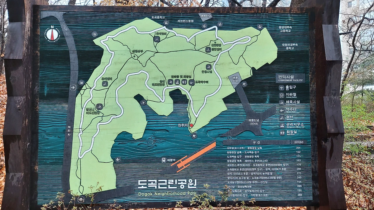 매봉산은 서울에서 흔한 이름의 산이다. 매봉산이라는 같은 이름의 산도 여러 개이고, 매봉재산, 응봉산(매가 한자로 '응'이니 ^^), 매봉 등의 이름의 산이 더 있다. 이곳은 도곡공원이라고도 불리는데 사실 매봉산과 공원이 같은 곳이다. 공원 둘레를 한바퀴 도는데 3km 정도이니 나의 목표인 1만 보를 걷기에는 조금 부족하지만 그럴 때는 이리저리 구불구불 구석구석을 걸어서 2바퀴를 돌면 된다. 산 자락을 따라 낮은 곳을 도는 둘레길을 한 바퀴 돌고나서 산정상을 가로지르는 산등성이 길을 걸어준다. 매봉산 정상이라고 해서 올라가기도 했지만 그다지 올라간다고 할 만한 느낌도 없는 정도로 걷기 좋은 길이다.