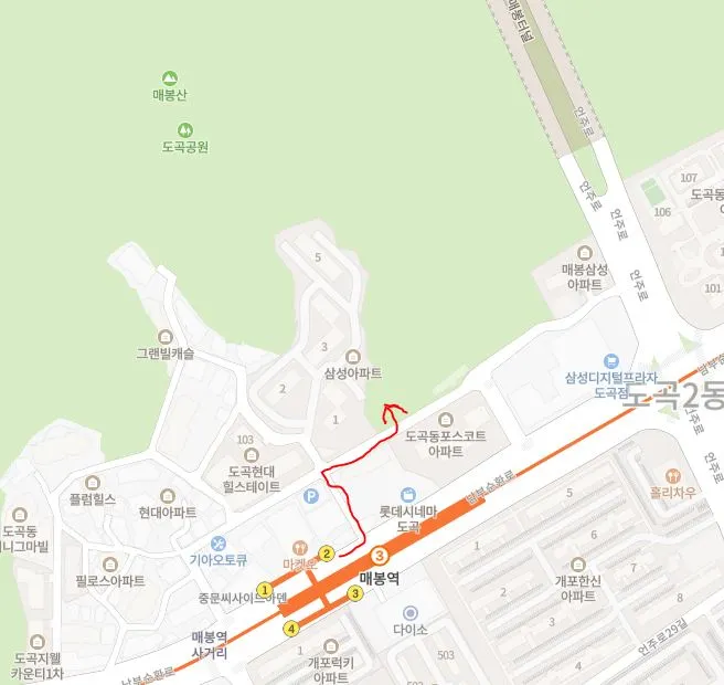 매봉산은 도곡동에 있는 작은 산이다. 산의 한쪽 모퉁이에 영동세브란스병원이 있으니 위치를 쉽게 알 수 있다. 물론 영동세브란스병원 쪽에서도 올라갈 수 있는 곳이지만 지하철로 쉽게 갈 수 있는 코스를 우선 설명해 둬야겠다. 지하철 3호선 매봉역 2번출구를 나와 직진하면서 대로변의 왼쪽 첫 번째 골목 안으로 들어간다. 그러면 지도에서처럼 아파트 단지 옆에 매봉산으로 들어가는 입구가 보인다.