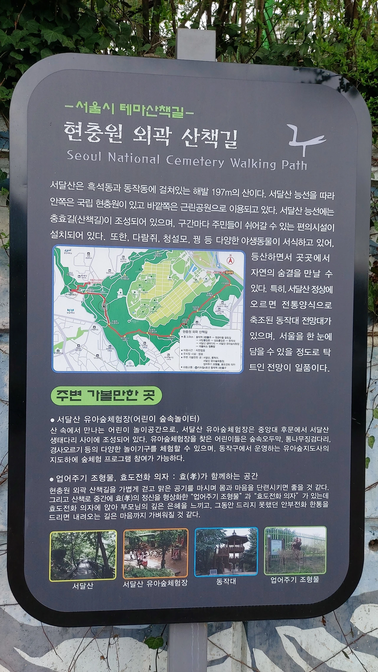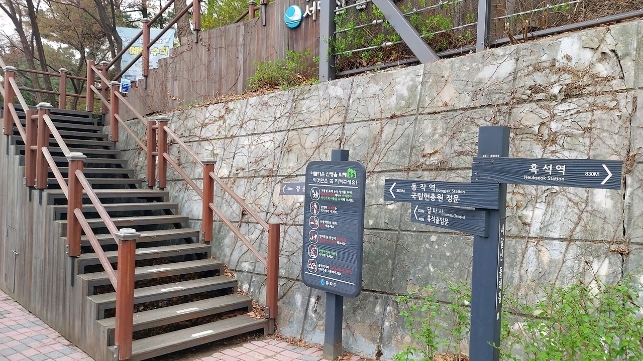 서달산은 서울현충원을 안고 있는 산이다. 지도에서 보면 현충원 전체를 날개를 펼치듯 둥그렇게 감싸안고 있다. 현충원 담장을 따라 걷는 이 코스는 동작역에서 내리면 바로 오를 수 있다. 3번출구로 나오면 바로 몇 걸음 앞에 입구가 있어 시계 방향으로 돌면 되고, 8번 출구로 나온다면 담장을 따라 조금 가서 시계 반대 방향으로 산책할 수 있다. 한마디로 서울현충원 정문을 바라보고 양쪽에 모두 오르는 입구가 있으니 시계방향이든, 시계 반대방향이든 마음에 드는 대로 돌아볼 수 있다. 나는 가끔 현충원 안으로 들어가서 산책삼아 돌아보기도 하지만, 포장된 길보다는 흙길을 걷는 게 좋아서 주로 외곽 산책길을 하게 된다.