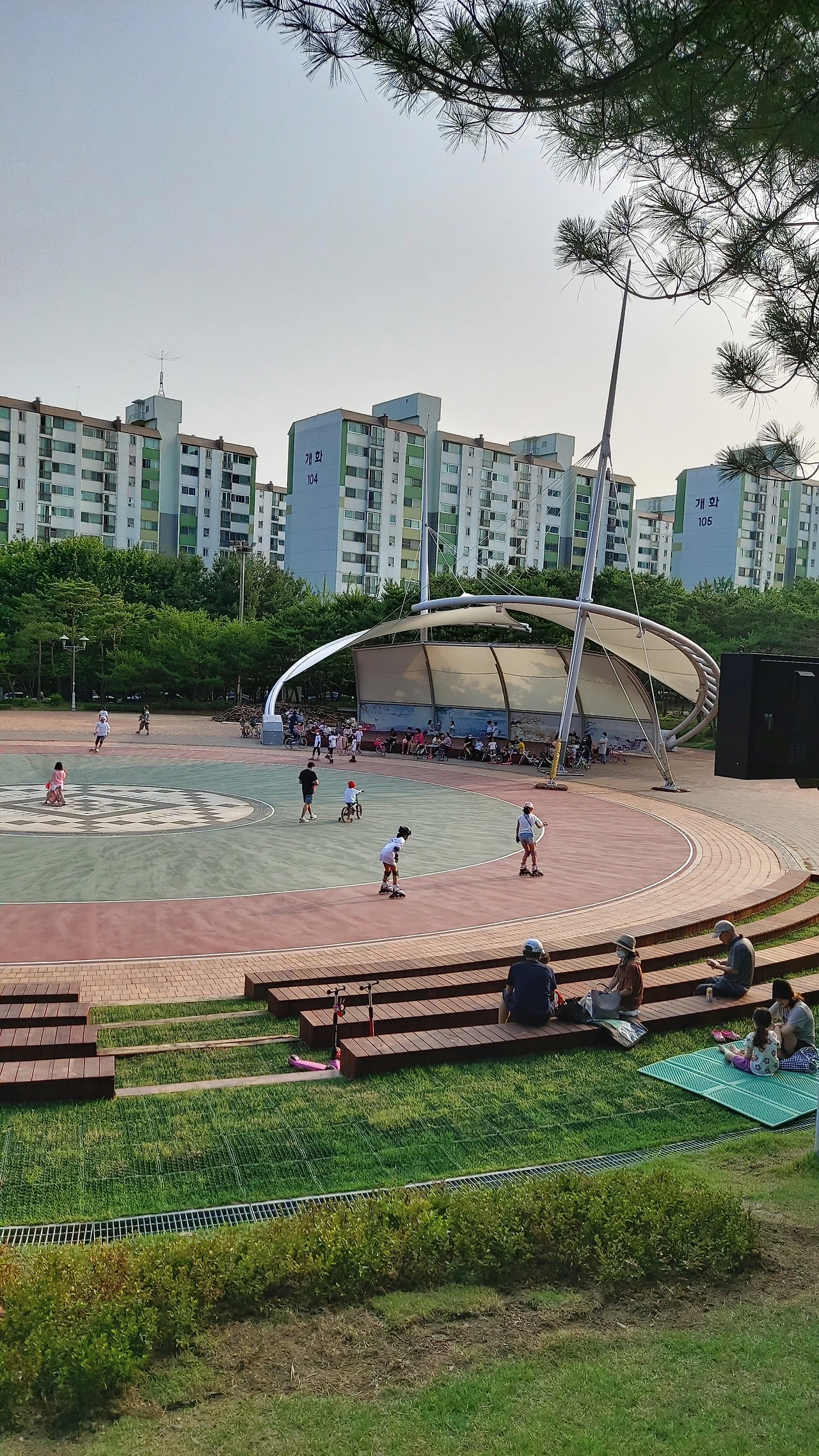 개화산을 한 바퀴 돌고 처음 출발했던 방화근린공원으로 내려오면 여러 가지 시설이 잘 갖추어져 있어 바로 집으로 돌아가기 보다는 앉아서 휴식을 하곤 한다. 여름에는 산자락 초입에 배치된 잔디밭과 벤치에 앉아 쉬는데 넓은 공간 전체에 나무 그늘이 잘 조성되어 있어 시원하게 땀을 식힐 수 있다. 봄, 가을처럼 덥지 않은 날씨라면 그 아래에 있는 정자에 앉아 연못의 잉어를 구경한다. 이 정자 주위에도 벤치가 많이 준비되어 있는데 그곳에서 장기를 두시는 어르신들이 많은 인기 장소다. 더 아래 쪽에는 농구장과 운동장에서는 학생들의 시합으로 시끌벅적하고 공연광장에서는 아이들이 자전거와 인라인, 퀵보드 등을 타며 뛰어다니고 있다.