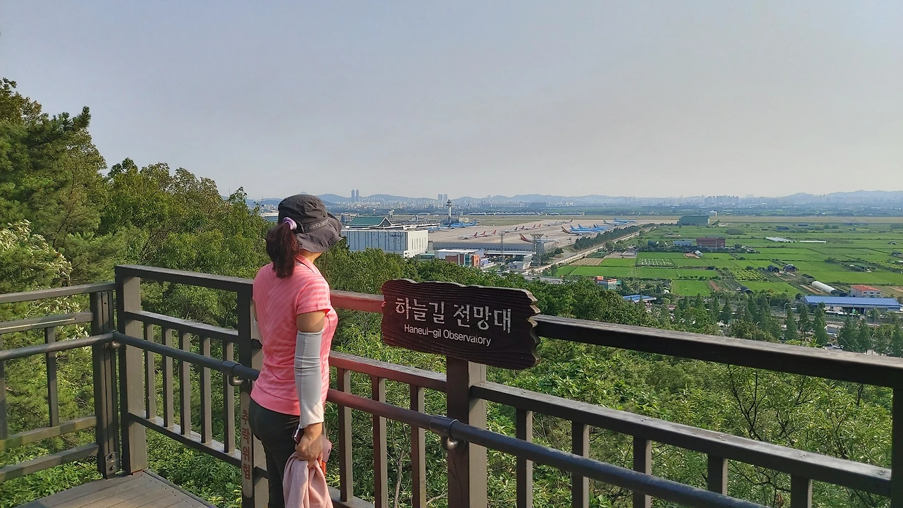 전망대가 여러 곳 있는데 그중 한강 방향과 김포공항방향의전망대는 앞이 훤하게 트여있어 보는 사람의 가슴까지 시원하게 해준다. 한강 쪽으로는 바로 눈앞에 방화대교가 있고 옆으로 길게 누워있는 한강과 강 건너 일산까지 바라볼 수 있다. 공항 쪽으로는 거대한 활주로와 줄지어선 대형 비행기가 보인다. 김포는 인천의 영종도공항에 비해 작다고는 하지만, 그래도 실제로 보면 공항 자체도 어마어마하게 크고, 공항은 사방이 시원하게 열린 곳에 만들어지기 때문에 더 넓어 보이는 점도 있다. 산의 양쪽으로 좋은 전망을 갖고 있는 산인 셈이다.