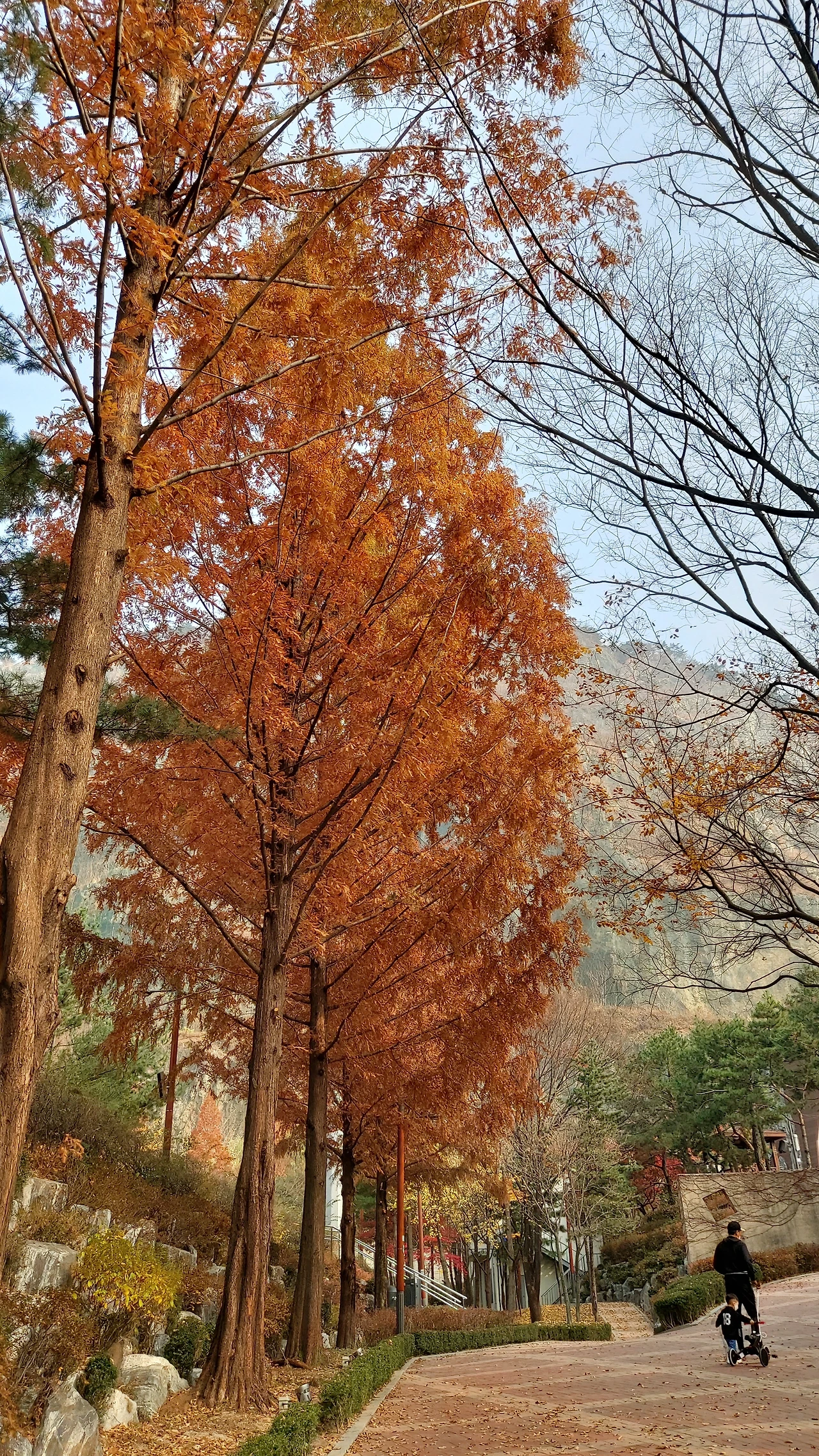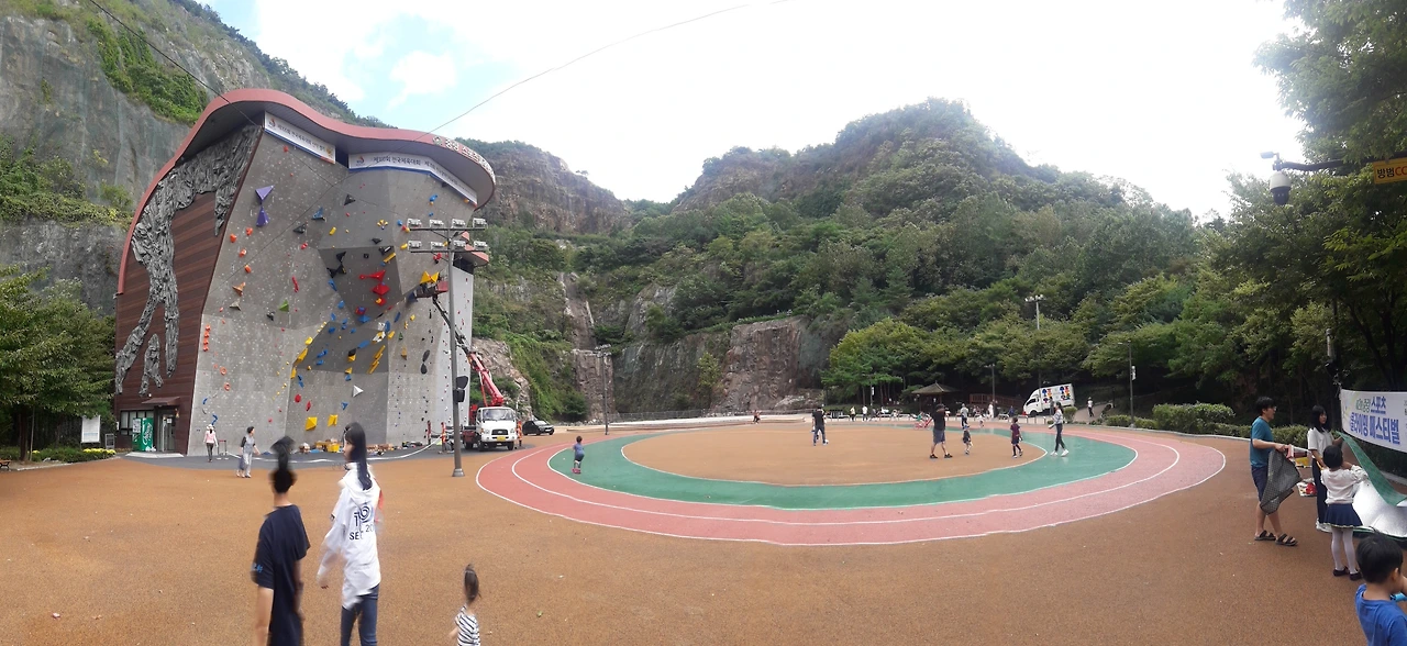 용마산의 재미 중에 하나는 용마산 입구에는 용마폭포공원이다. 공원의 규모도 크고 시설이 좋다. 큼직한 잔디축구장의 초록도 눈이 시원하고 무엇보다 90도로 깎아지른 절벽에서 떨어지는 폭포와 인공암벽 등반 시설이 좋다. 절벽 앞 광장은 엄청난 크기인데, 둥그런 광장을 따라 자전거, 씽씽, 킥보드를 탄 아이들이 신나게 돌고 있다. 공원을 가로질러 산 입구로 오르는 길에는 커다란 나무들이 줄지어 있고, 다른 쪽으로 생태공원까지 조성되어 계절마다 풍경이 볼만하고 가을단풍은 일부러 찾아와서 볼만 하다. 나도 산을 오르기 전에 꼭 공원을 한 바퀴 돌며 구경하고 올라가게 된다.