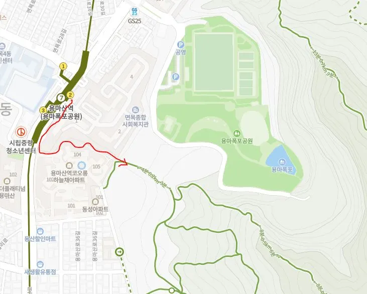 용마산역 2번출구를 나와서 반대편으로 돌아서서는 바로 왼쪽의 골목으로 들어간다. 아파트 단지 안으로 들어가 가로지르면 바로 용마산 입구가 보인다. 용마산은 동네 산책으로 운동이 부족한듯 싶을 때 경사도 적당히 있고 거리도 넉넉하게 걸어서 땀을 아주 조금 흘려보려고 할 때 가면 좋은 곳이다. 용마산은 동네 야산보다는 크지만 그다지 높은 산은 아니다. 그래서 경사진 계단을 조금만 가면 어느새 정상에 올라있다. 중간에 조금 힘들다 싶은 곳에는 계단을 설치해두어 전체적으로 크게 힘들지 않고 등에 땀이 촉촉히 배는 정도의 운동이 된다.