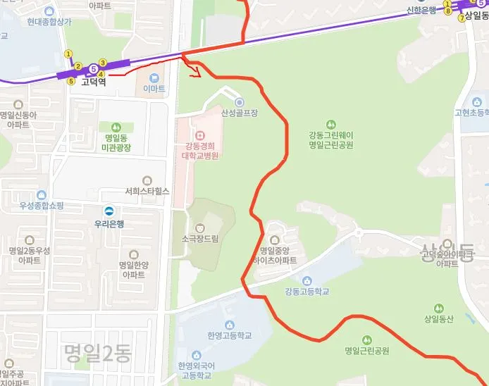 고덕역 4번출구에서 나오면 바로 앞쪽에 이마트가 보인다. 이마트 앞 횡단보도를 걷너면 바로 산길이 시작된다. 왼쪽으로 돌면 고덕산 쪽으로 3km 정도의 거리를 산길을 따라 걸을 수 있다. 나는 주로 오른쪽의 명일근린공원을 지나 승상산, 일자산을 거쳐 5km 정도 걸어 둔촌오륜역 쪽으로 간다. 반대로 둔촌오륜역에서 출발하는 것도 좋다.