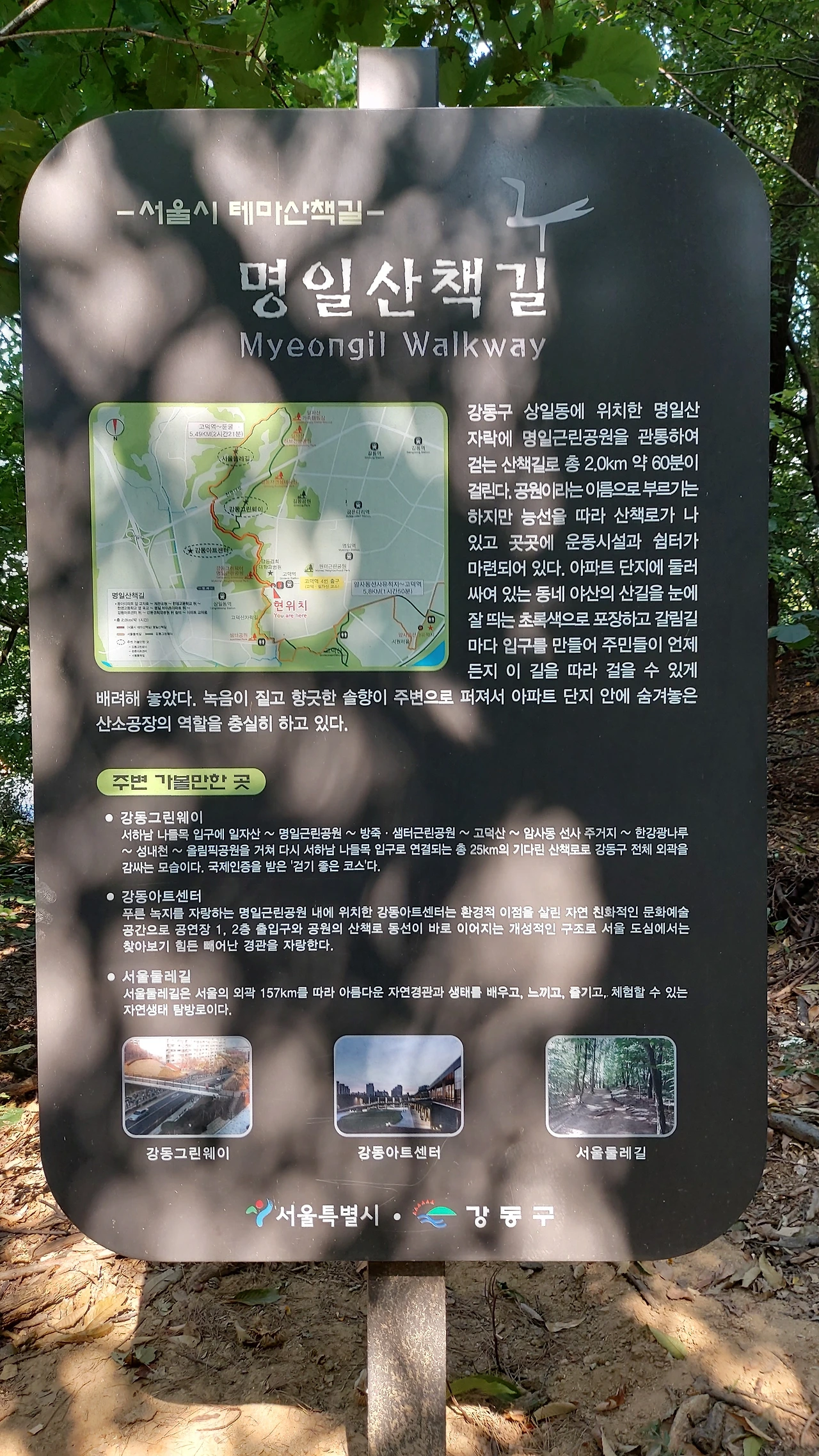 이 길은 강동그린웨이와 서울둘레길 3코스가 겹치는 구간이다. 서울시와 강동구청이 함께 만든 코스이니 산책길의 시설 수준은 말할 것도 없이 좋고, 코스를 따라서 주변에 근린공원, 캠프장, 자연생태공원, 천문공원, 체육관 등 이용할 수 있는 시설이 줄지어 있다. 한마디로 강동구의 대표적인 주민복지 지역이다.