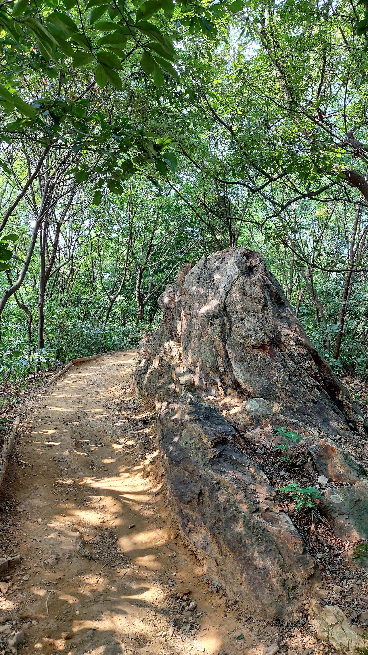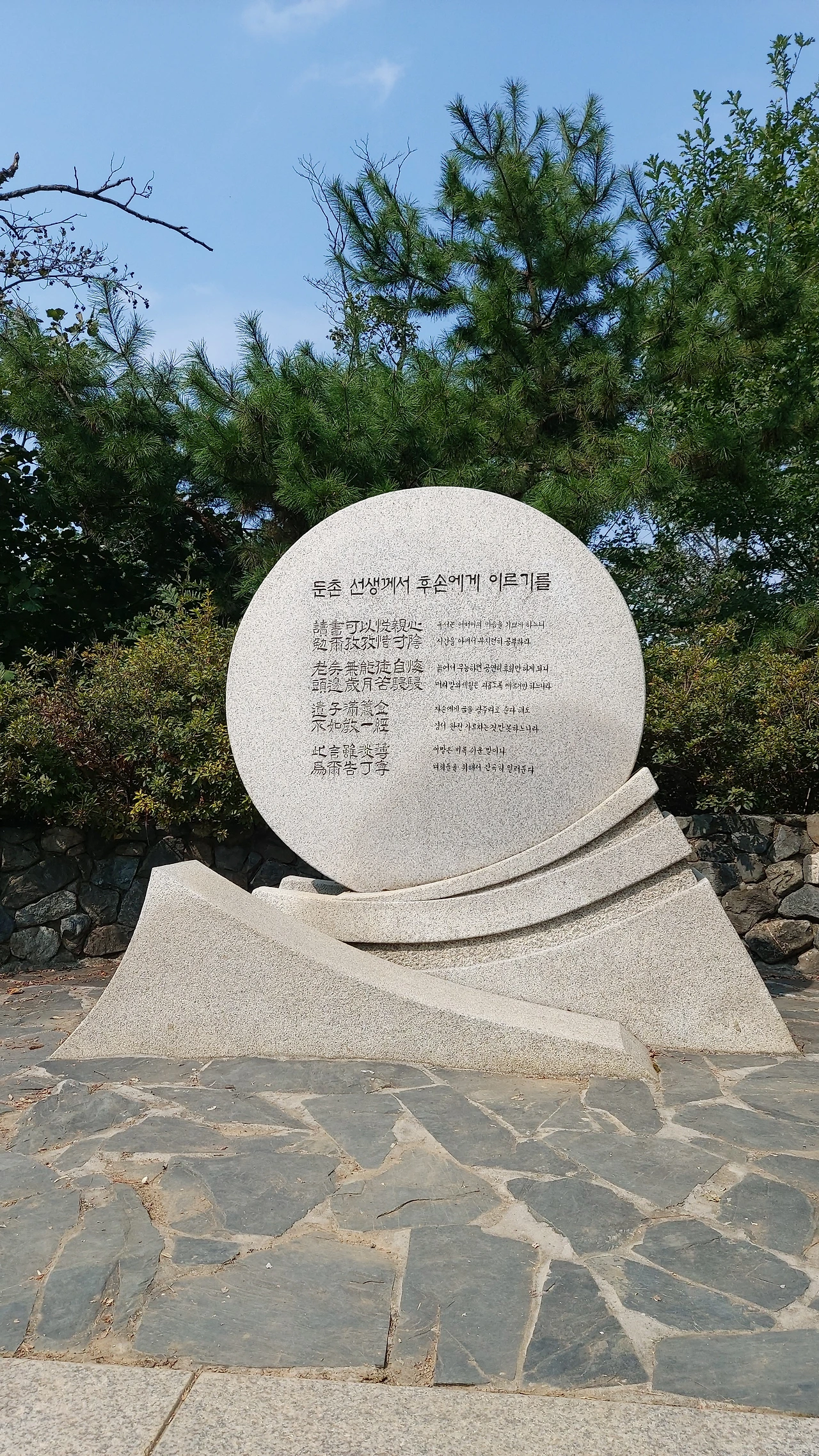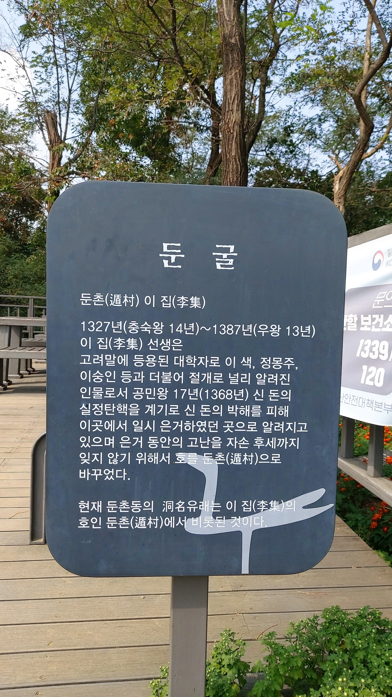 여러 동네를 다니며 산책을 하다 보면 중간에 만나는 안내문에서 그 동네 이름의 유래와 유적에 대해 알게 되는 것도 중요한 재미이다. 일자산에서도 산길 중간에 세워진 안내문을 만나 둔촌동이 고려 공민왕 때 신돈의 모함으로 유배를 와 이곳에 정착한 둔촌 선생에서 유래되었다는 것을 알게 되었다. 안내문 옆에는 벤치와 함께 기념으로 돌비석까지 멋지게 세워놓아 산책러의 발길을 잠시 잡아두고 있었다.