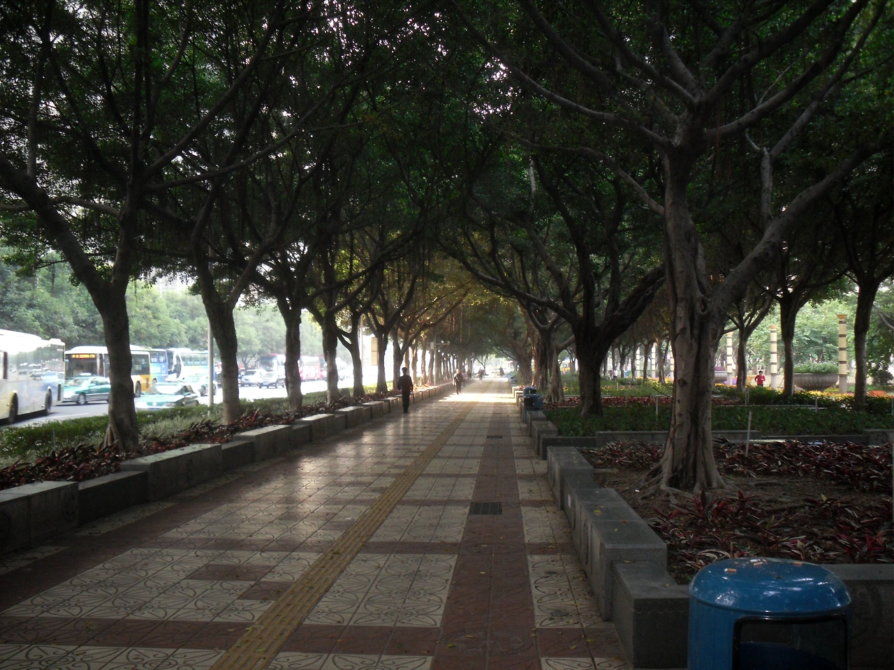사진) 광저우 동역(東驛, 东站) 인근의 가로수 길. 빽빽이 들어선 나무로 대낮임에도 어둠이 깔린 것처럼 짙은 그늘이 만들어져 있다. (2010년 11월 광저우 출장 시)
