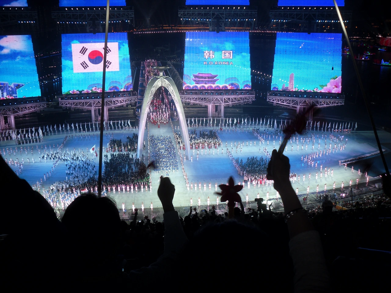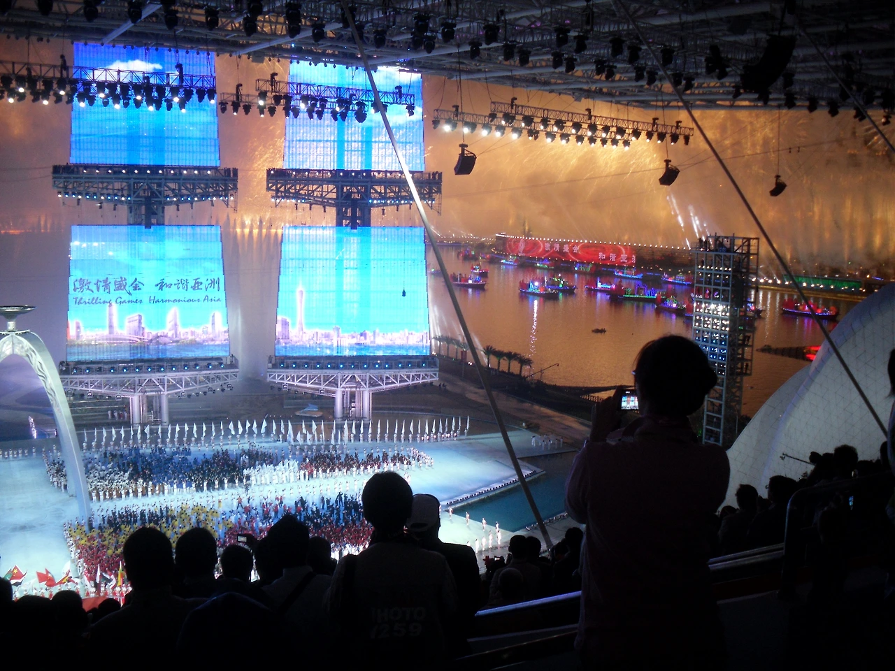 사진) 광저우 아시안게임 개막식 모습. (2010. 11월) 우측 사진에 보면 주강(珠江)과 주강 위 불꽃놀이 모습이 보인다 좌측 사진은 한국 선수단이 입장하는모습.