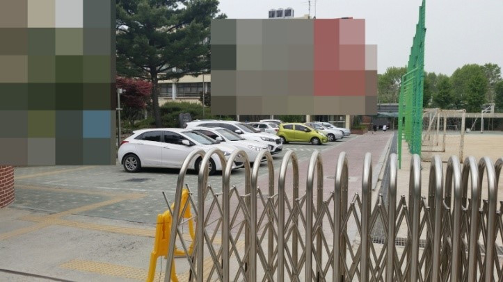 사진) 교직원 차량은 교정에 주차되어 있는 반면, 학생들의 자전거는 학교 담 외부 인도에 방치돼 있는 모습