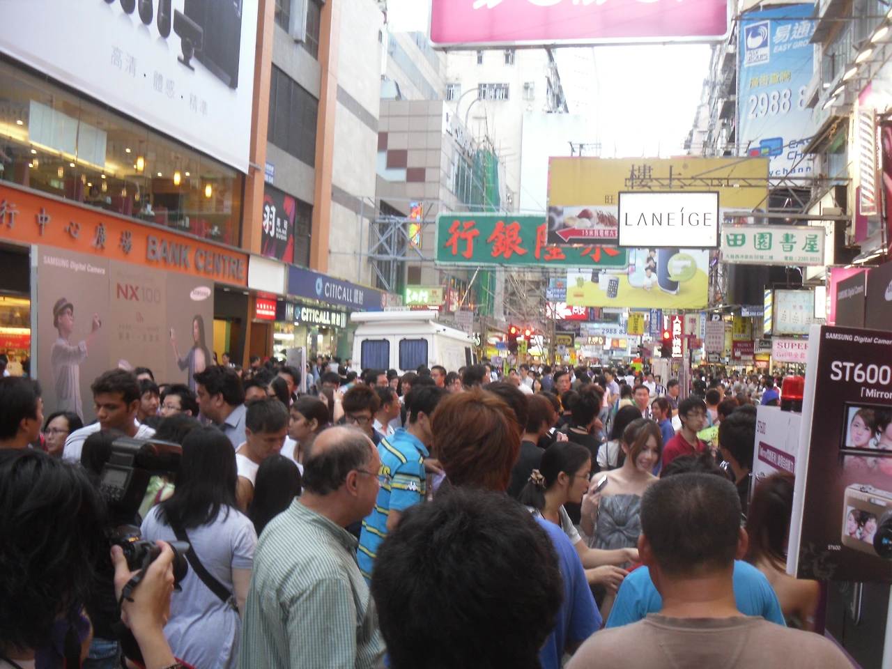 사진) Mongkok 거리의 인파와 상점. 관광객들이 몰리는 이곳의상점 종업원들이 영어를 제대로 구사하지 못하는 경우가 점차 늘어나고 있었다 (2010. 10월).