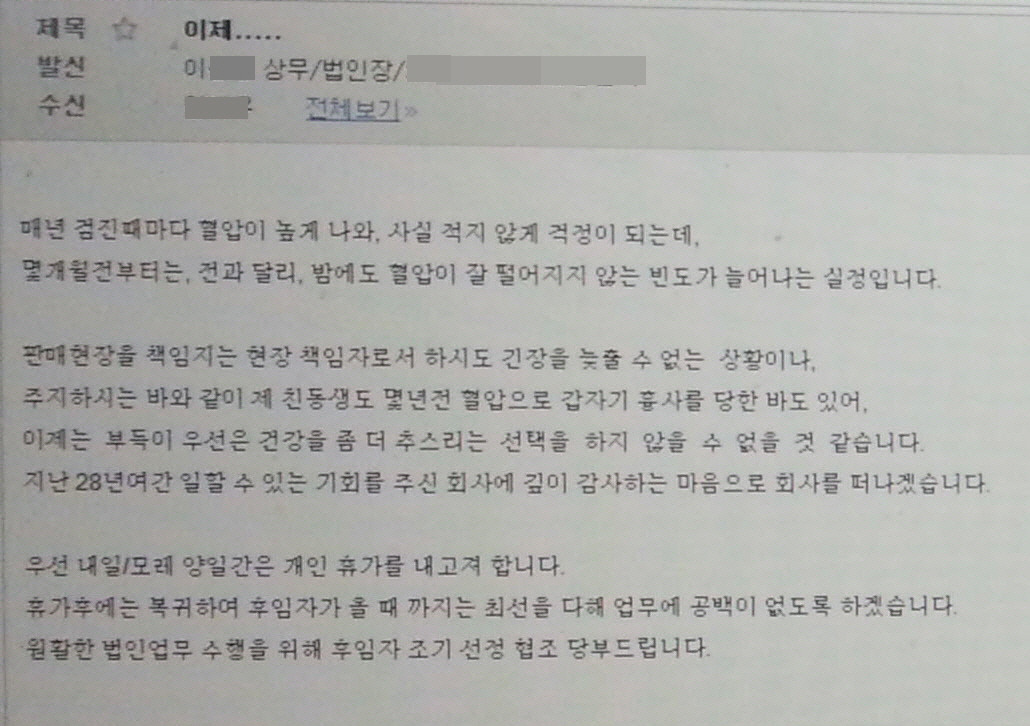 결국 사표를 쓰는 것으로 결심을 굳혔다. 하지만 28년여간 다녔던 회사를 그것도 현지 법인장으로 해외에 주재원으로 나와 있는도중에 갑자기 사표를 쓰기는 정말 쉽지 않았다. 그럼에도 불과 4년 전에 겪었던 친동생의 갑작스러운 죽음, 또 그간 연속해서 나타났던 신체의 변화 그리고 마지막으로 그러한 모든 건강상 문제들의 근본적인 원인이었던극심한 스트레스를 이러한 직장 생활을 지속하는 한 앞으로도결코 피할 수 없을 것이라는 결정적 판단에 마침내 사표를 썼다.