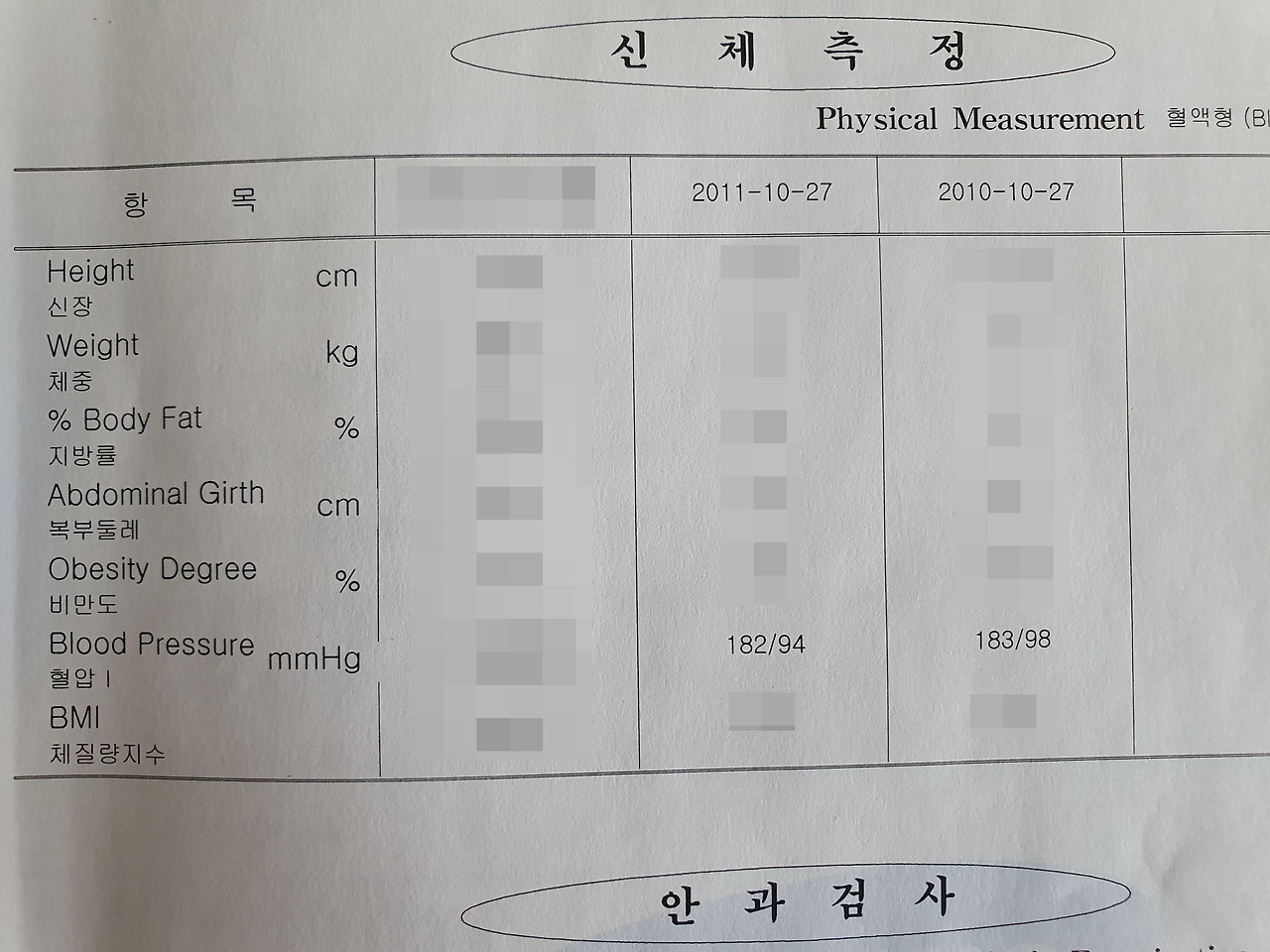 사진) 2010년과 2011년에측정했던 혈압. 수축기 혈압이 180이 넘었는데 이것도 혈압이 너무나도 높게 나오니 여러 차례 추가 측정해서 가장 낮게 나온 수치를 기록한 것이다.
