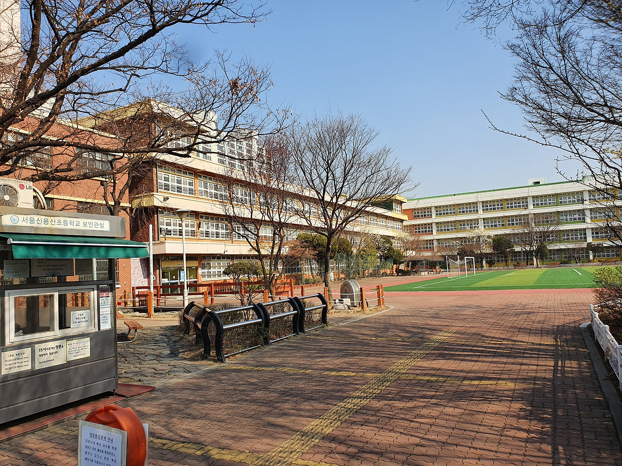 1971년 완공된 한강맨션(좌측)과, 1968년 완공된 신용산초등학교(우측) 건물 (2020년 3월 사진)
