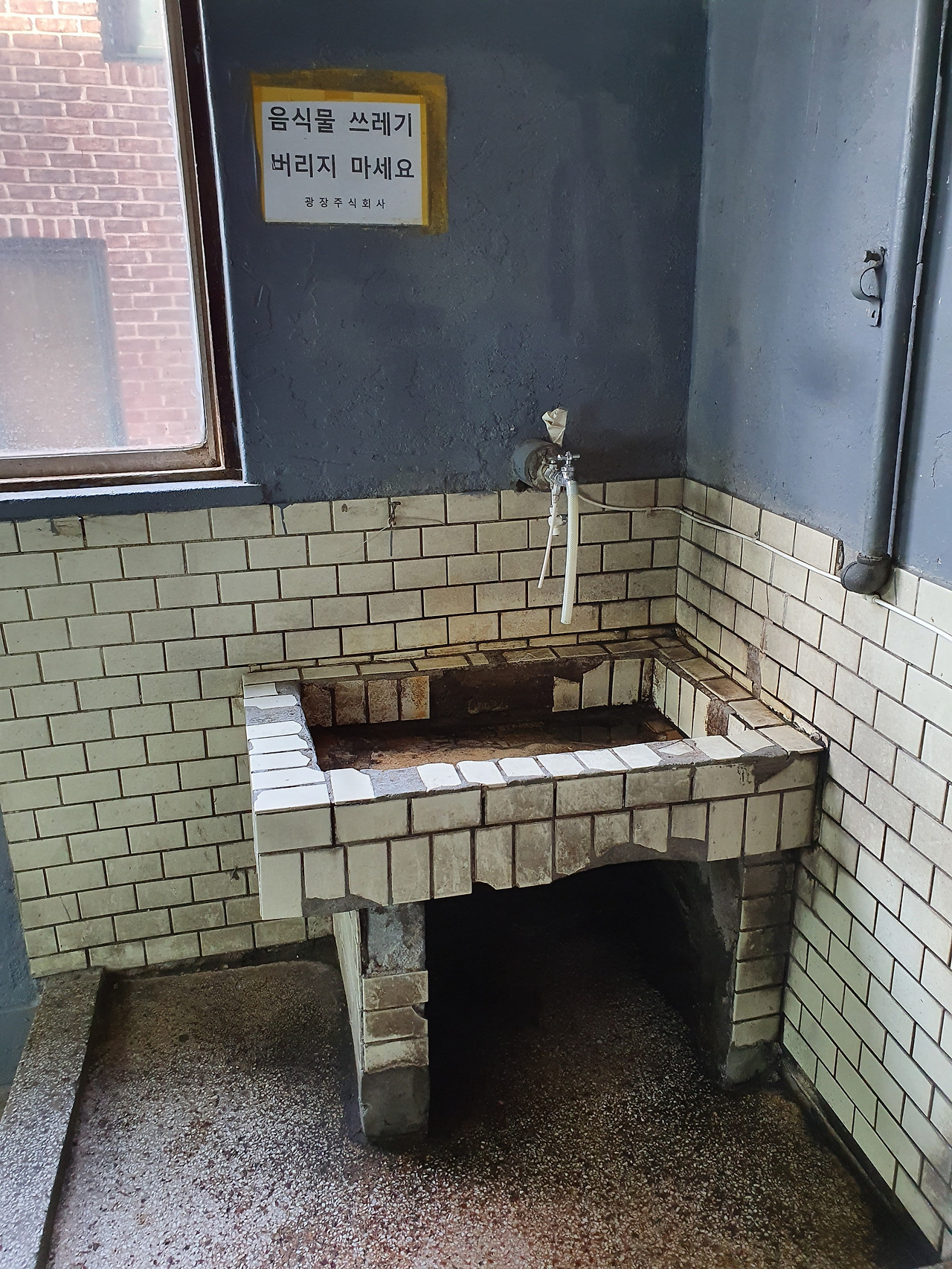 광장 시장 한 구석에서 마주친 꽤 나이 들어 보이는 세면대. 도기나 스테인리스도 아니고 타일과 시멘트로 만들어진 이런 세면대는 중고등학교 시절 주로 많이 봤던 것 같은데, 여기저기 타일도 떨어진 채 방치되어 있는 모습이 적어도 50~60년 전에 제작된 것 아닌가 싶다. 반백년 이상 시장과 함께해 온 세면대인 것 같다 (2020년 2월 사진)