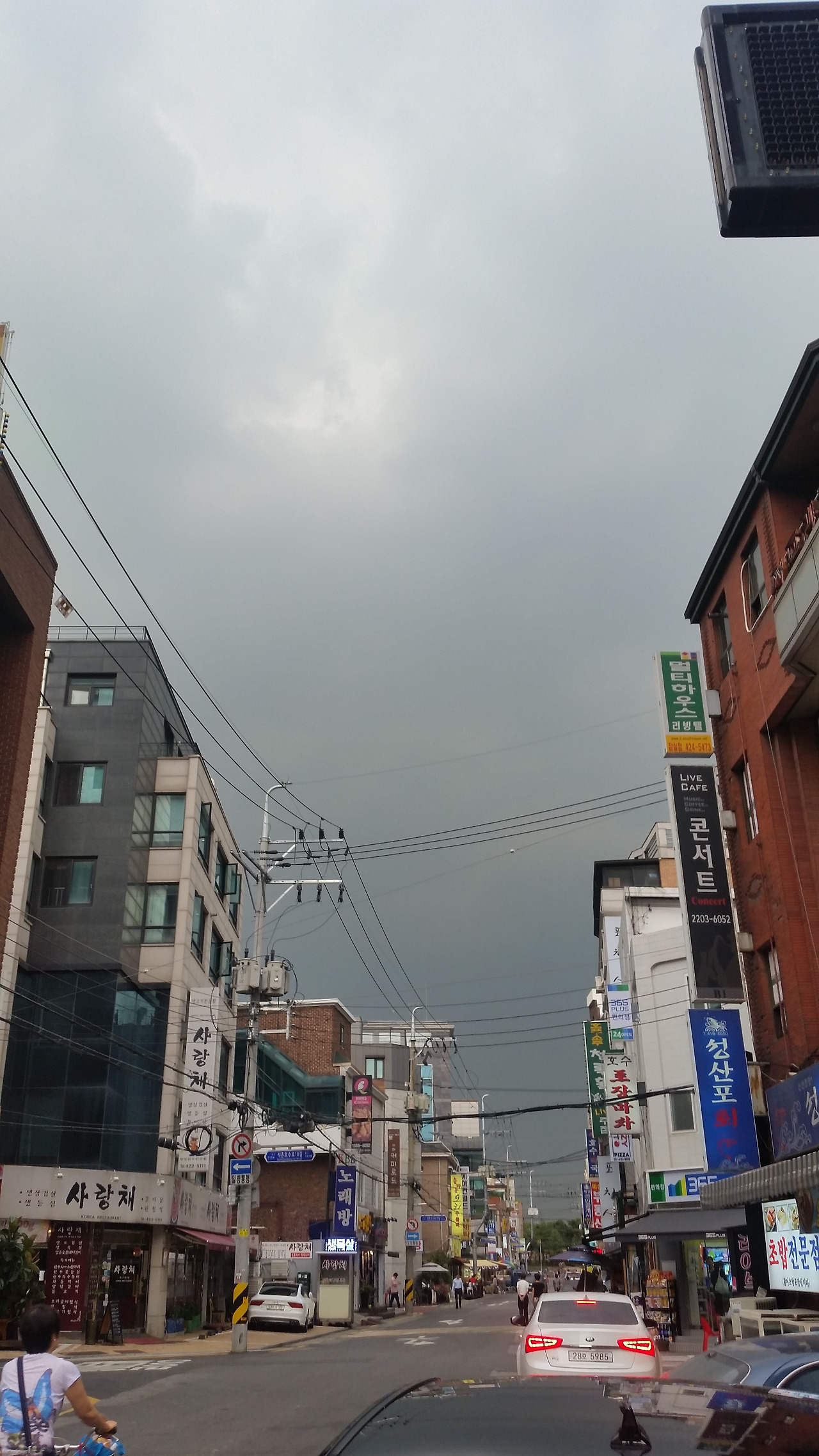 석촌호수로 18길 골목 모습과 시커먼 하늘. 비가 쏟아붓기 직전 사진인데, 사진상으로는 그다지 컴컴해 보이지 않지만 실제로는 당시 오후 1 시경이었음에도 저녁이 된 것처럼 갑자기 꽤 컴컴해졌던 상황이었다. (2015년 6월 사진)