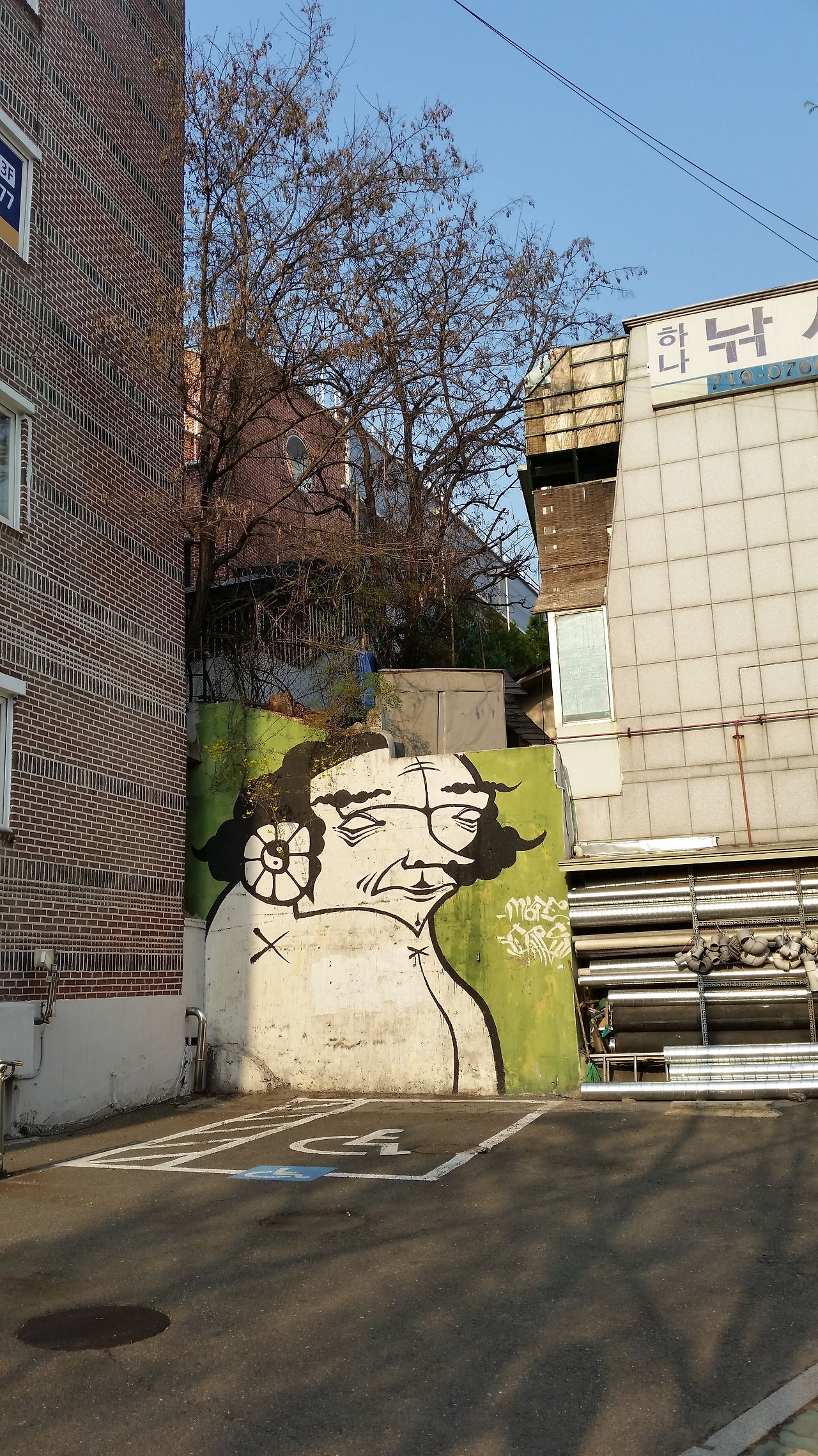 대흥역 근처에 '군자네'라고 고등어조림을 아주 잘하는 집이 있다. 지인과 그곳에서 만나기로 한 날 시간이 좀 남아 근처 신수동 골목길을 헤맬 때 찍은 사진이다. 인적도 드문 골목인데 그 한적한 곳에 의외로 저렇게 특이하고 큰 벽화가 그려져 있었다. (2017년 4월 사진)