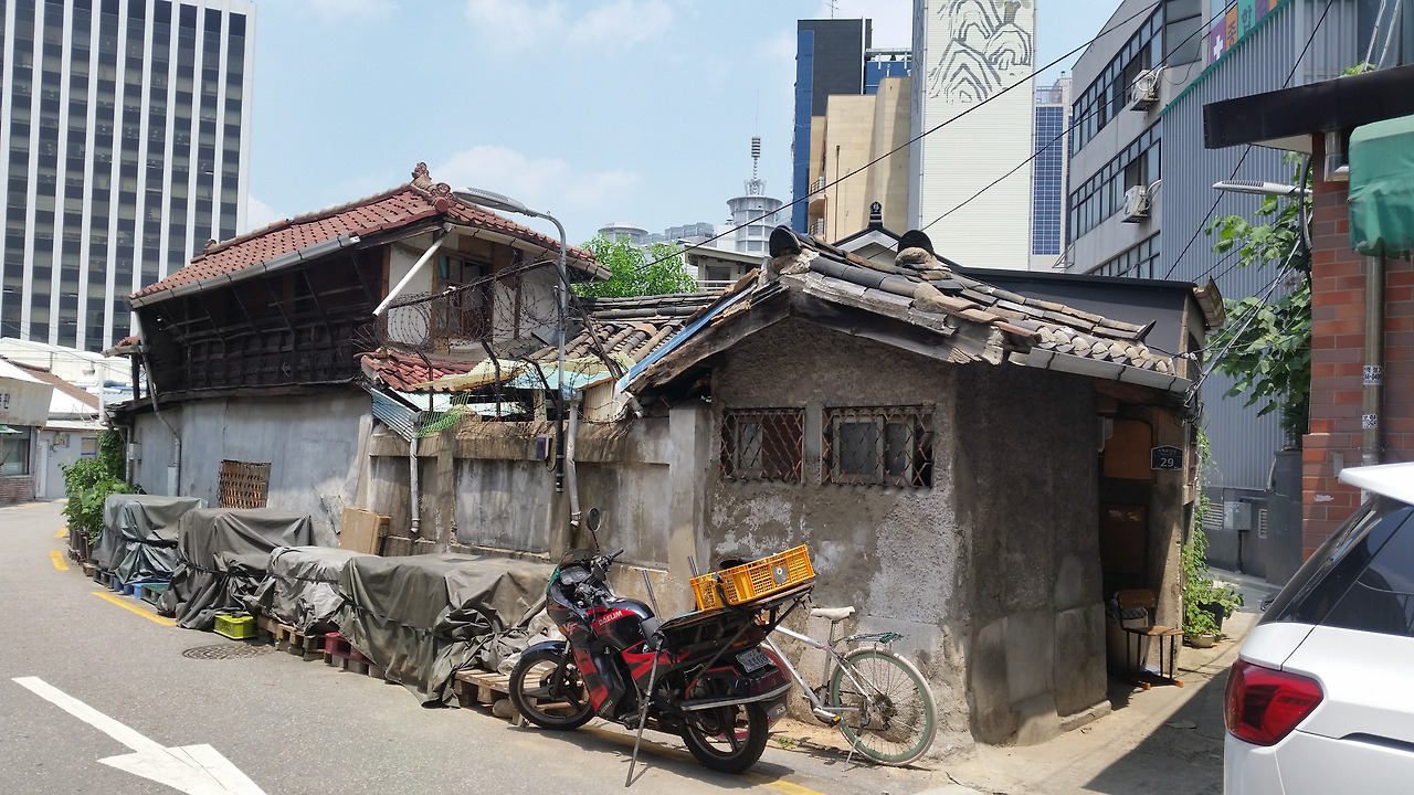 동대문 역사문화공원역 근처, 퇴계로 58길 29에 있는 주택 모습. 주변은 모두 고층 오피스 건물로 바뀌었는데 낡고 오래된 주택들이 몇 채 그 사이에 이렇게 남아 있었다. (2018년 7월 사진)