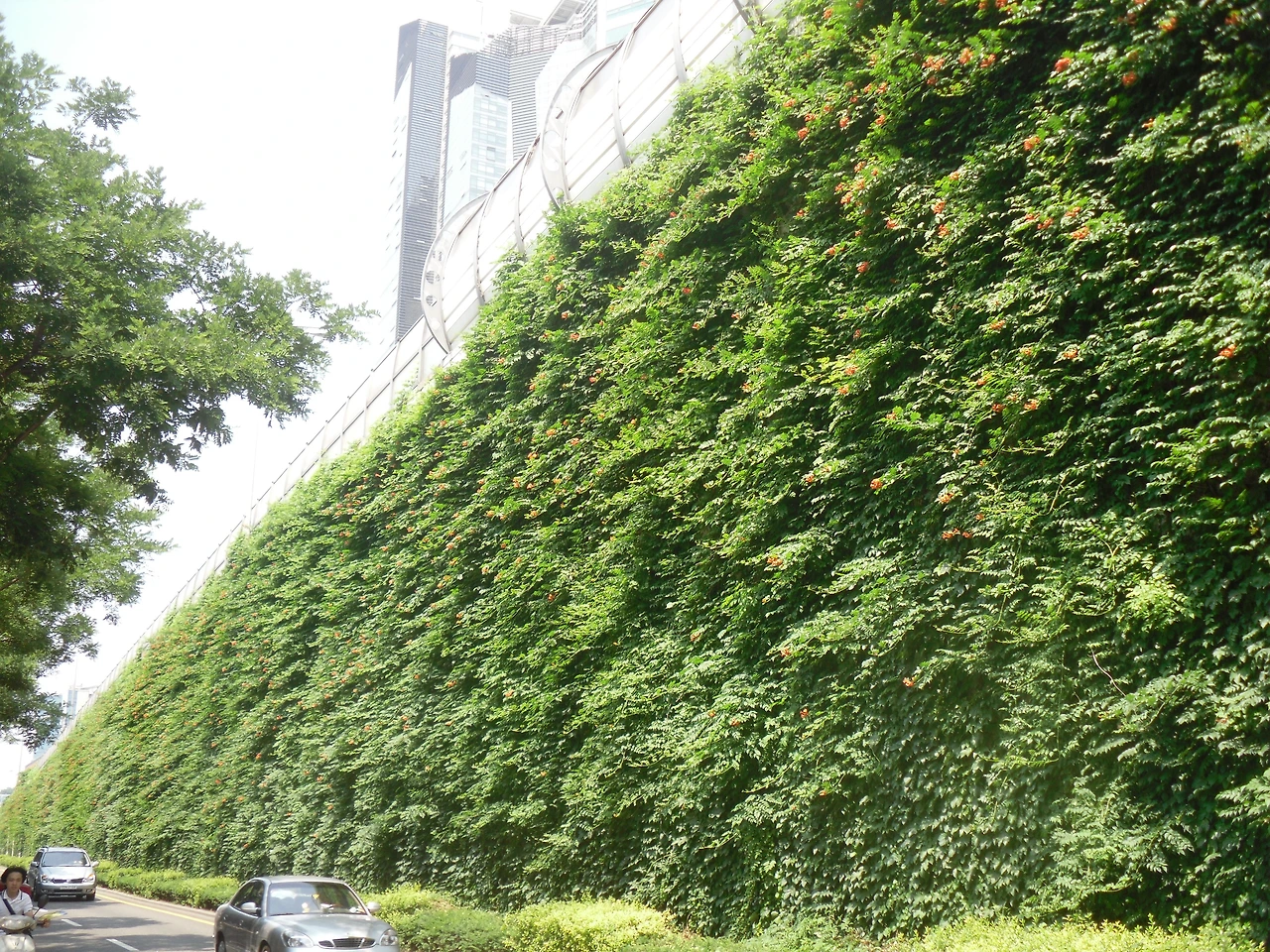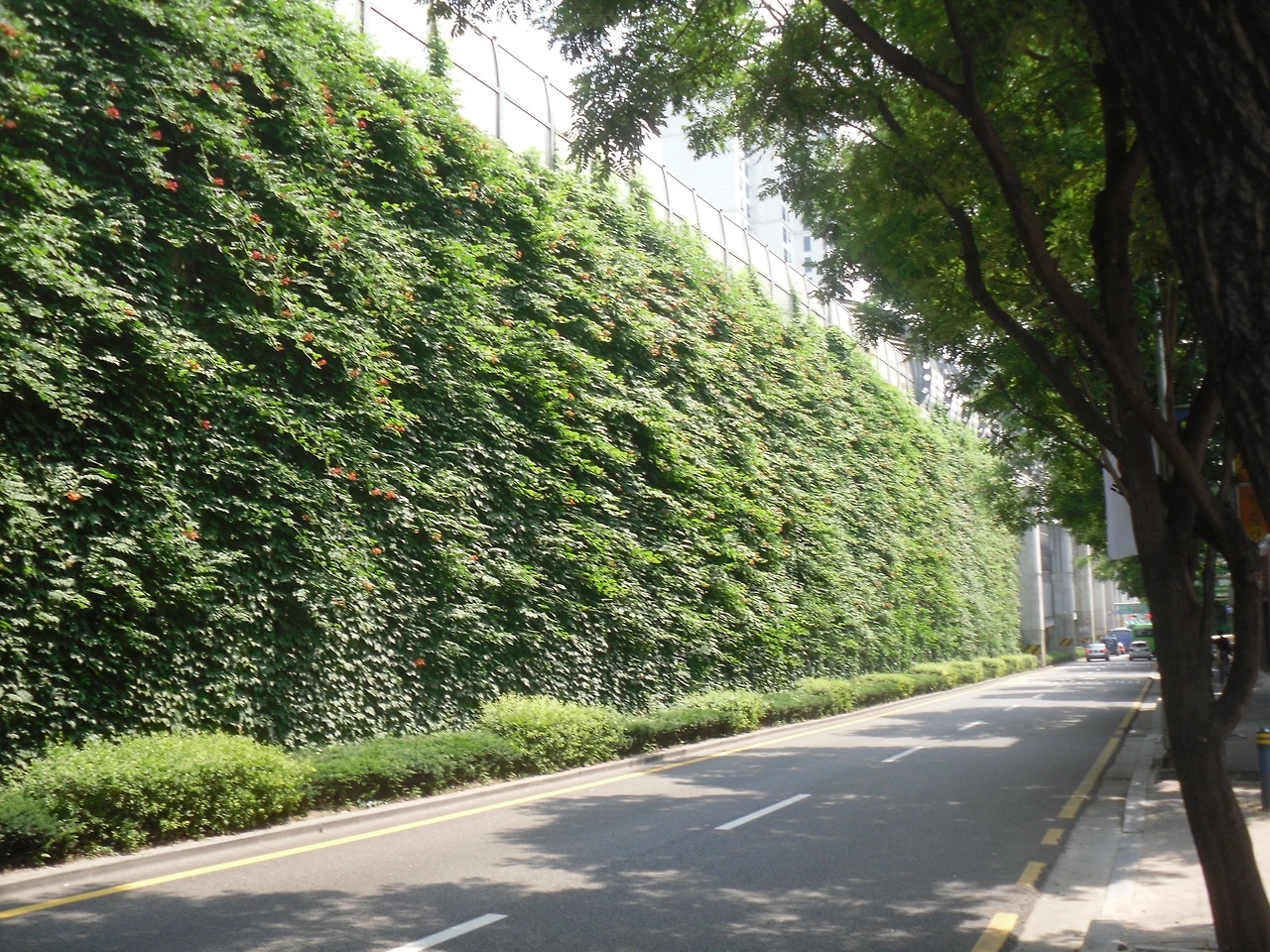 건대입구역 5번 출구로 나와서 신양초등학교 방면으로 가다 보면 고가도로가 나오는데, 그 고가도로 벽을 온통 뒤덮고 있는 담쟁이덩굴 사진. (2010년 6월 사진)