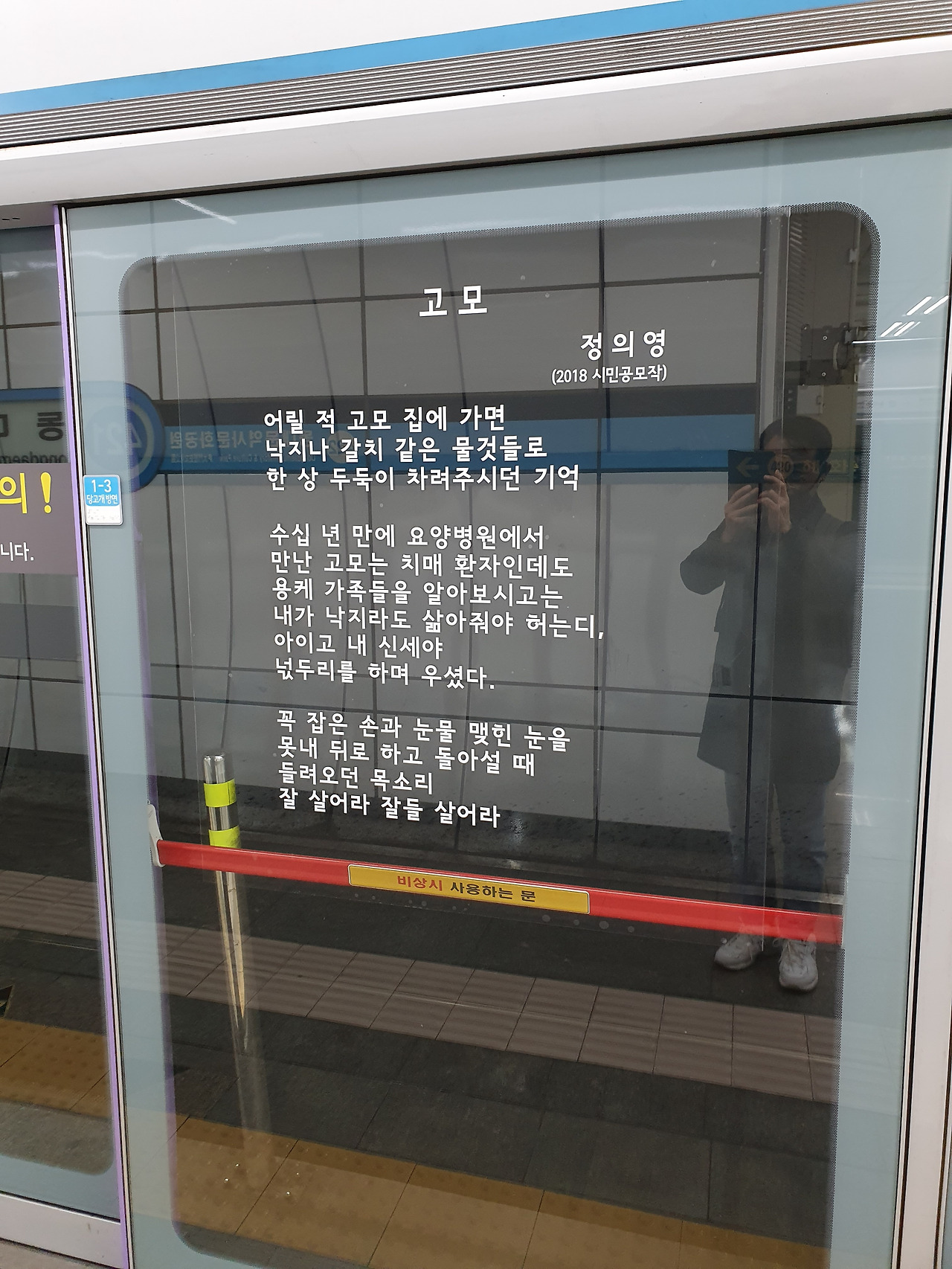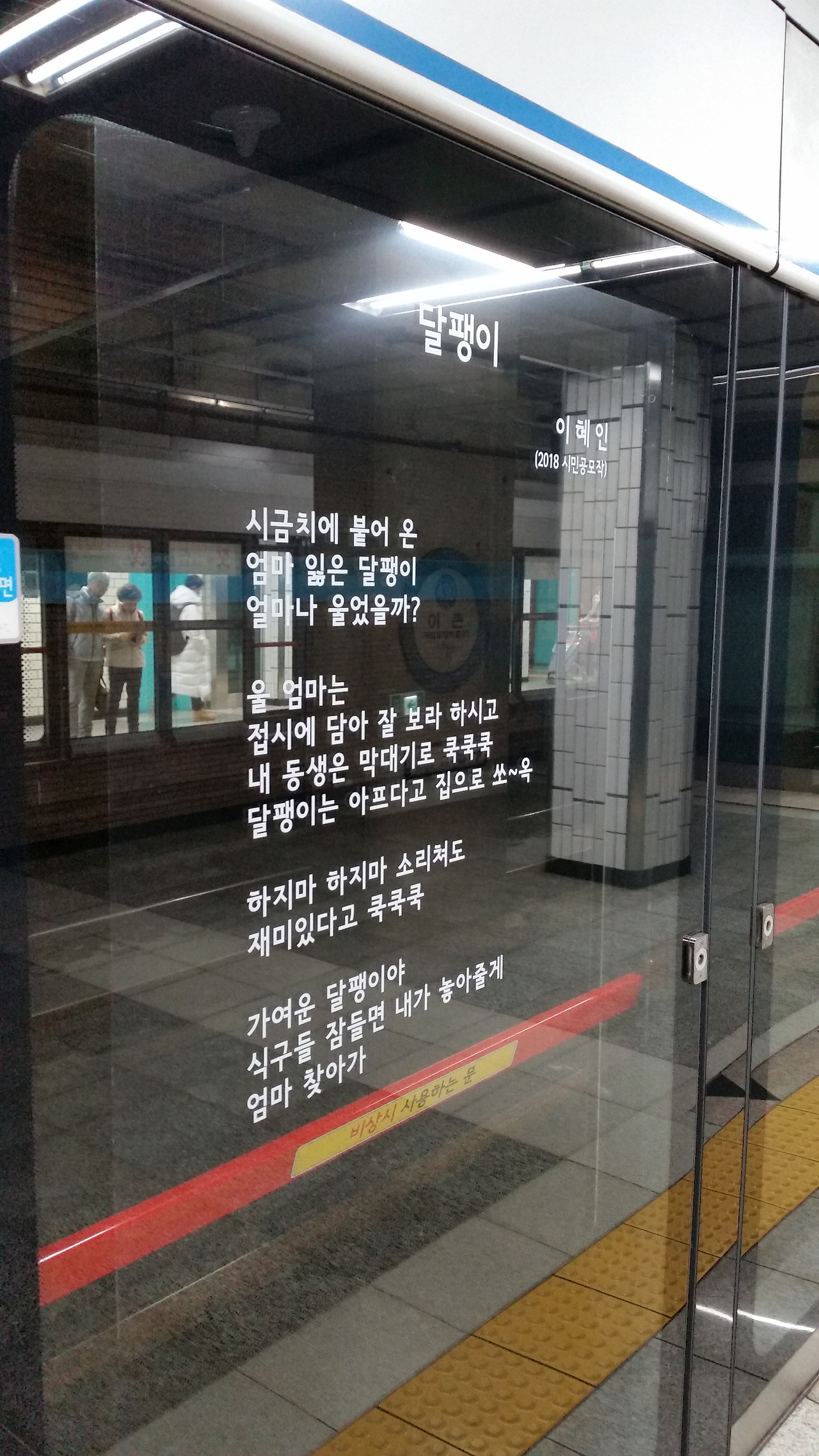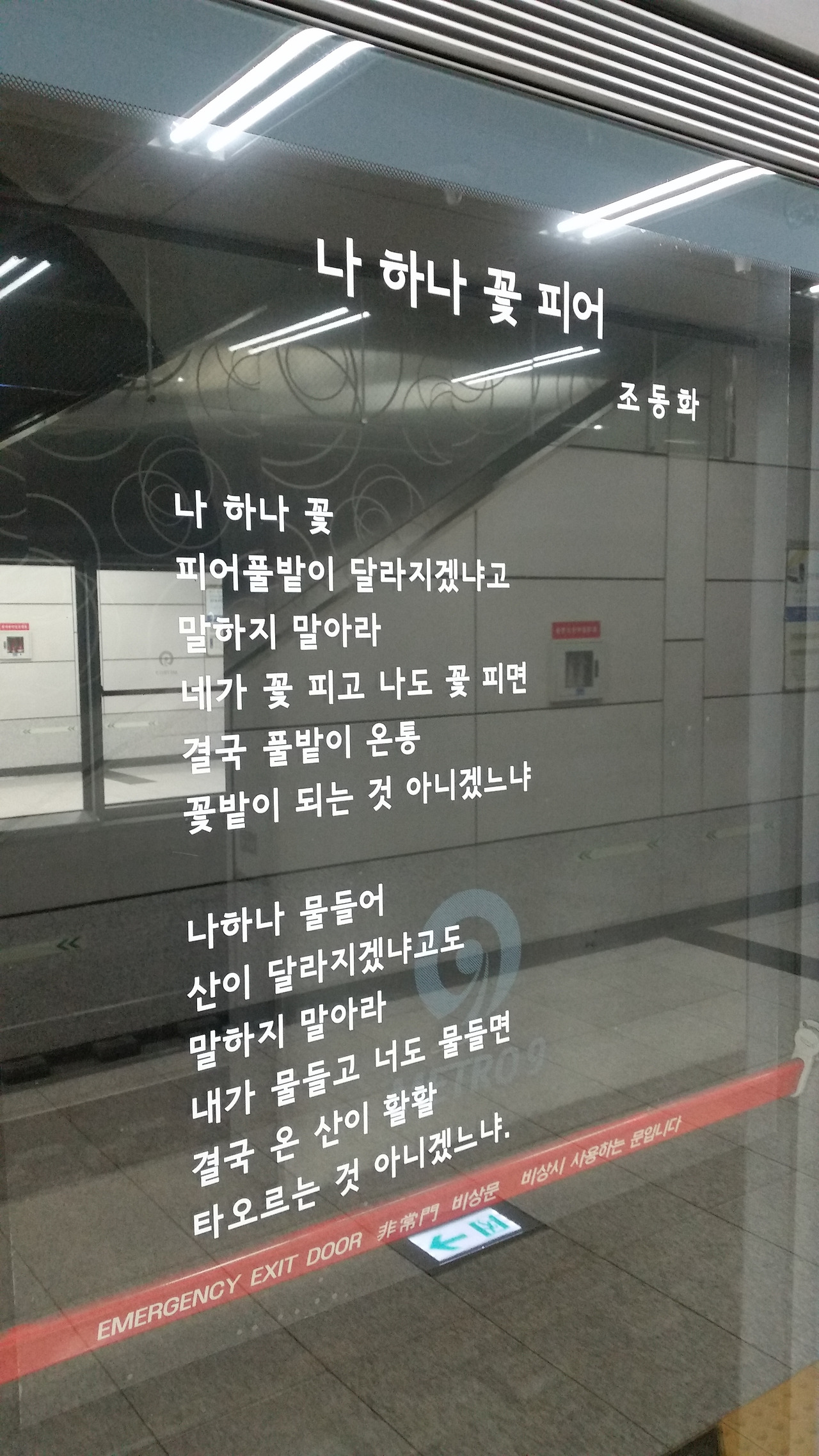 언제부턴가 지하철역에 시와 같은 문학 작품들이 많이 눈에 띄기 시작한 것 같다. 지하철역 벽에서도 시를 볼 수 있지만 사람들이 전철을 기다리면서 자주 접하게 되는 스크린 도어에서도 볼 수 있다. 전철역에서 마주쳤던 그런 시 작품 중 인상적이었던 작품 사진 몇 장을 올린다.