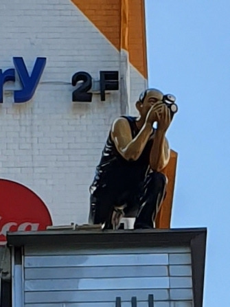 충무로 '영화인의 거리'라는 곳 모습인데, 얼핏 보면 잘 안 보이지만 자세히 보면 사진 중앙 좌측 상단에 카메라를 들고 뭔가를 찍는 사람이 보인다. 실제 사람은 아니고 조각품인데 워낙 정교하고 작품 규모도 실제 사람과 유사해서 처음 얼핏 보고는 정말 사람이 지붕으로 올라가서 주변을 찍고 있는 것으로 착각했다. (2019년 11월 사진)
