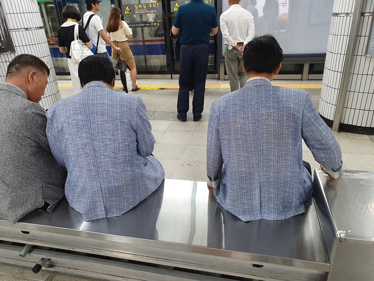 가운데 계신 분이 먼저 자리에 앉아 있었는데 잠시 후 오른쪽에 계신 분이 나타났다. 그런데 옷이 이렇게 똑같으면 뭔가 좀 거북해서 다른 자리로 가서 앉을 것 같은데, 새로 등장하신 분도 아무런 내색 없이 자신과 똑같은 옷을 입은 분 옆에 태연하게 앉으셨다. 두 분은 전철 탈 때까지 아무런 대화도 없으셨다.(2019년 7월 사진)
