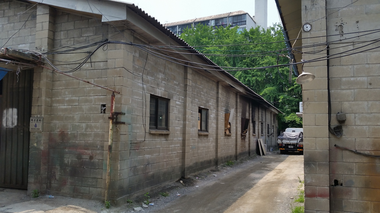 성수동 어느 뒷골목에 있는 공장 건물 모습. 최근까지도 가동되었던 공장인 것 같은데, 내가 방문하던 시점에는 가동이 중단되어 있었다. 아직도 붙어 있는 간판들을 보면 공구나 주방용품 같은 것들을 생산했던 공장이었던 것 같다. (2015년 5월 사진)