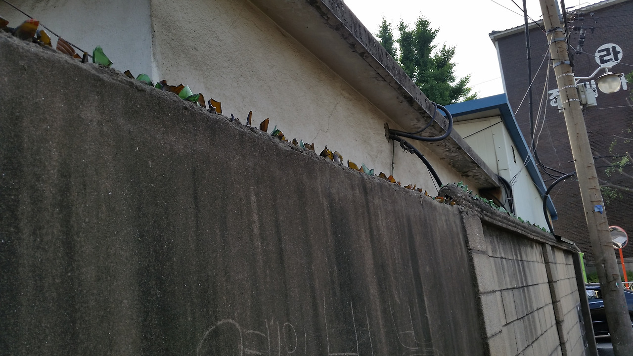 성수동 1가 '카우앤독'이라는 건물 옆 골목길 사진. 70년대에는 도둑이 워낙 많아서 이렇게 담 윗부분에 깨진 병 파편을 박아 놓은 집들이 많았다. 하지만 최근에는 이런 식으로 유리를 박아 놓은 담을 거의 한 번도 보지 못했던 것 같은데, 여기서 오랜만에 그런 담을 다시 보게 되었다. (2015년 5월 사진)