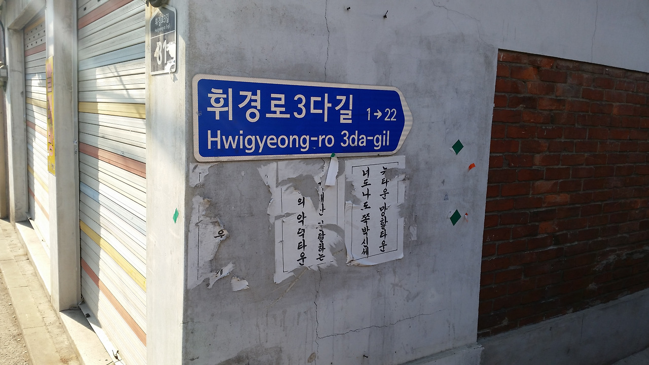 '휘경로 3다길'이라는 표지가 보이는데, 그 바로 아래에는 "뉴타운 망할 타운, 너도나도 쪽박신세"라고 적혀 있다. 재개발을 추진하는 사람들이 있는 반면 그것을 반대하는 사람들도 있는 모양인데, 어떤 이해관계가 있는지는 잘 모르겠다.(2015년 1월 사진)