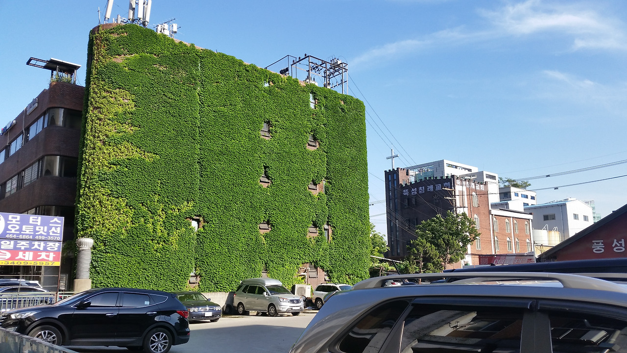 성수역 인근 뚝섬 침례교회 앞에 있는 건물인데, 건물 벽 한 면 전체가 무성한 담쟁이덩굴로 완전히 뒤덮여 있는 모습이다. 건물이 이불을 뒤집어쓰고 있는 것 같다. (2015년 8월 사진)