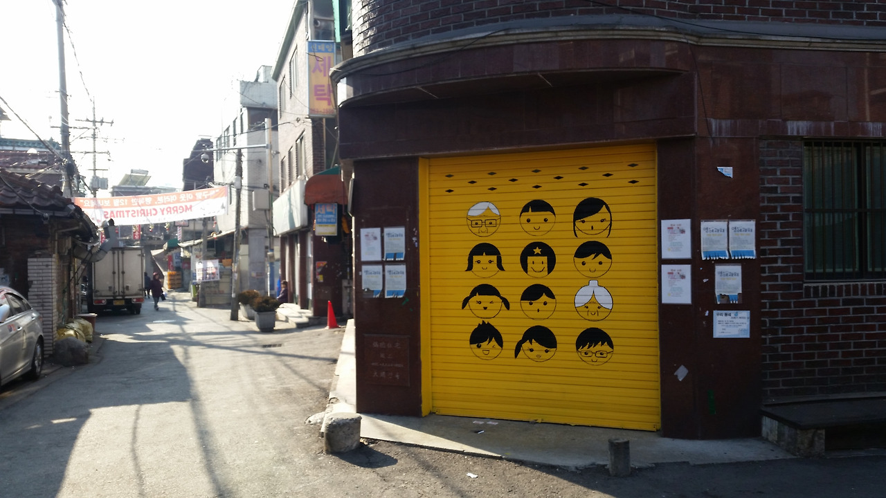 셔터문이 눈에 띄는 노란색으로 칠해져 있는 것도 특이한데, 그 위에 그려진 그림은 더 인상적이다. 할머님과 할아버님은 머리색이 흰색이다. 매우 간단한 그림임에도 누가 누군지 확연히 구분되는 것 같다. 이 셔터와 그림 역시 재건축과 함께 사라질 것이다. (2015년 1월 사진)