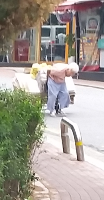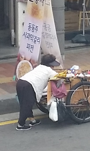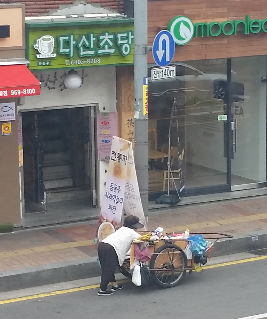허리가 거의 90도 가까이 굽으신 어르신들이 폐지가 가득 담긴 손수레를 힘겹게 끌고 가시는 모습. 외대 근처 거리를 배회하다 마주친 모습이다. 어르신들이 저렇게 하루에 50kg 정도의 폐지를 모아서 팔면 약 2500원 정도 수입이 생긴다 한다. 하루 일당이 시간당 최저임금에도 못 미치는 셈이다 (2015년 6월 사진).
