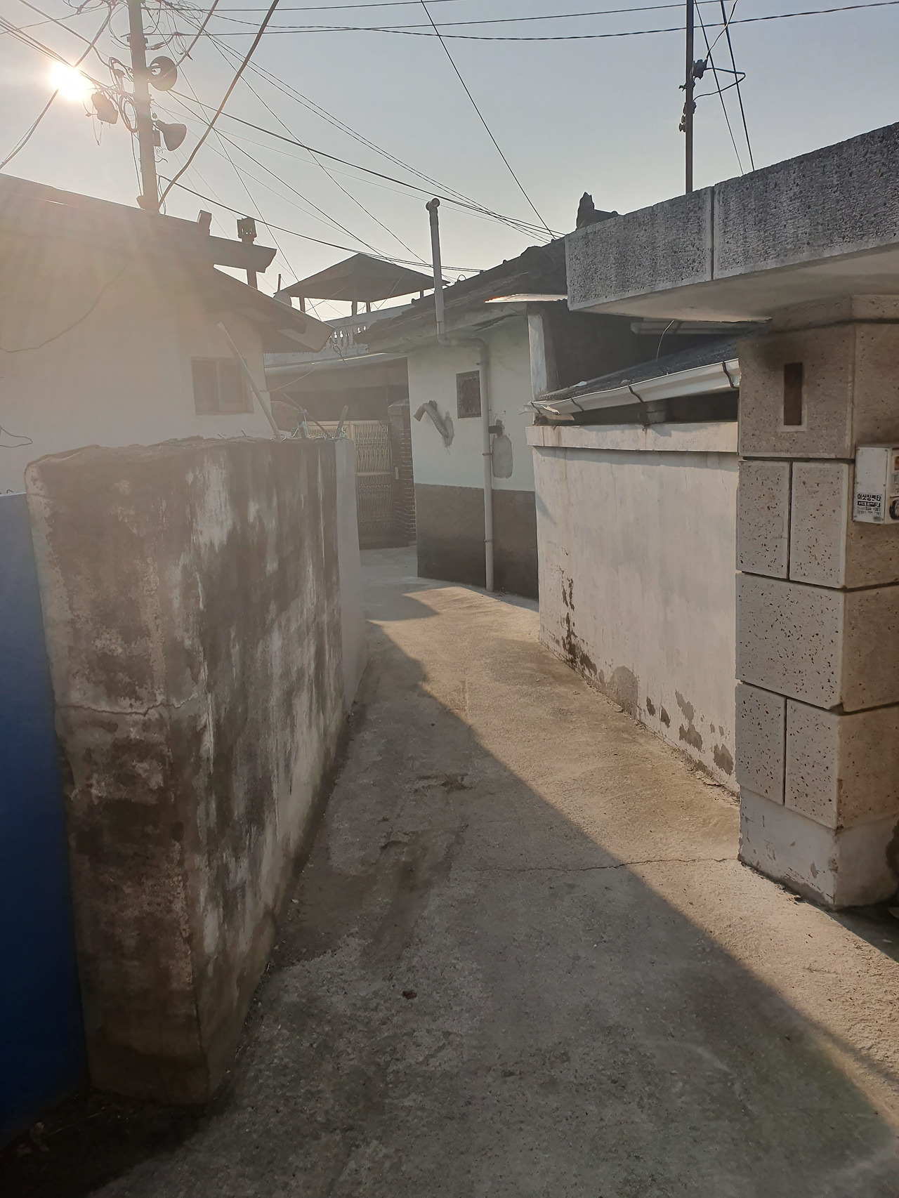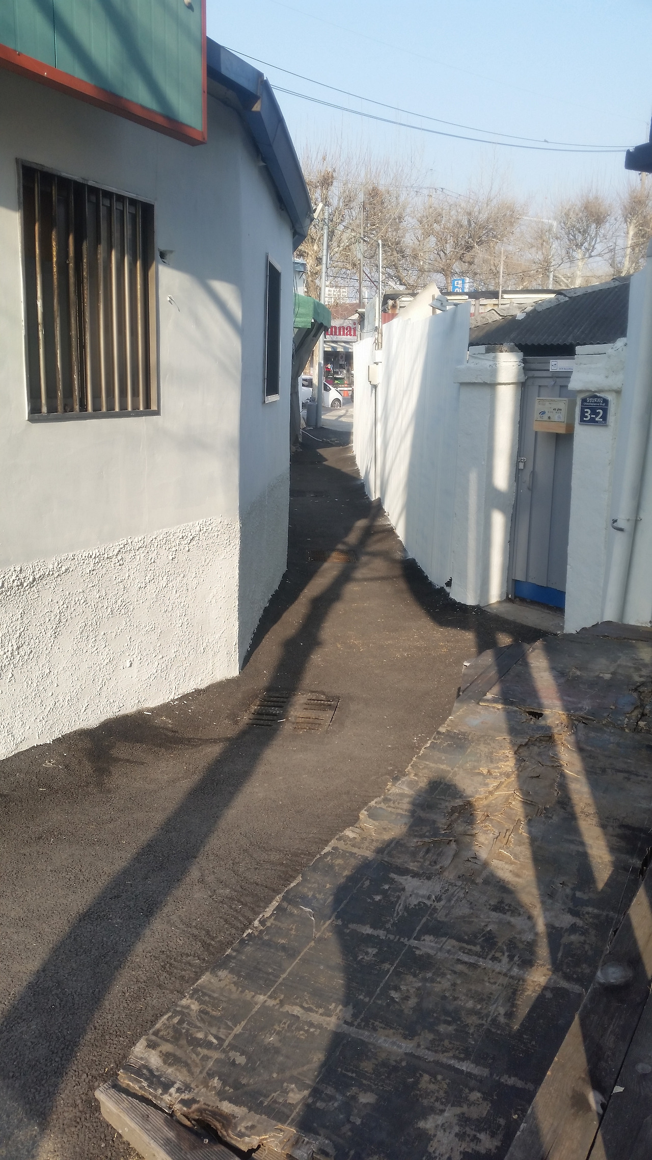 대구역 뒤편 칠성남로 30길에 있는 조용한 골목길과 주택 모습. 흰색으로 칠한 외벽에 내려쬐는 햇살이 따듯하게 느껴진다. (2018년 3월 사진)