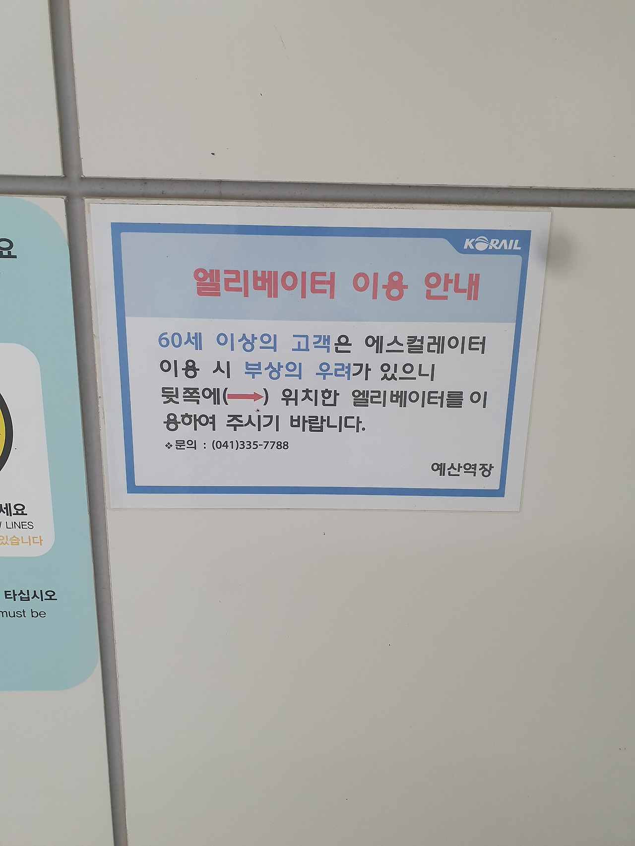 충청남도 예산역에 부착되어 있는 문구. 수명이 늘어나면서 요즘에는 70대 이상되는 어르신 인구가 워낙 많아 60대는 전철을 타도 경로석 근처에는 감히 얼씬도 못한다 하는데, 예산역에 있는 이 문구에는 60세 이상은 에스컬레이터 타기도 위험하니 엘리베이터만 이용하라고 적혀 있으니 좀 의외다. (2020년 1월 사진)