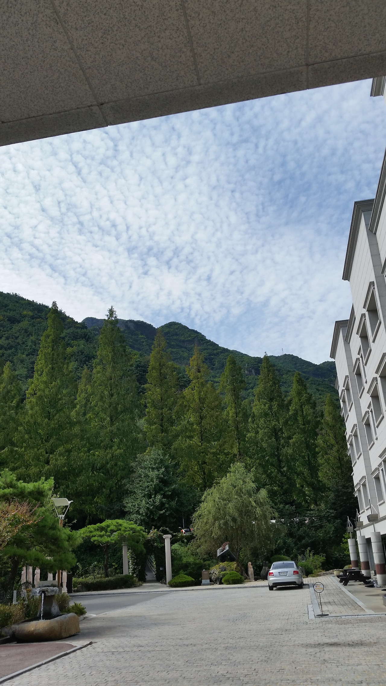 금오산 호텔 앞에서 바라본 금오산과 양 떼 같은 흰구름이 가득한 하늘 모습 (2017년 9월 사진). 이른 아침이라 더 그랬겠지만 호텔이 산속에 위치하고 있어 공기는 너무도 상쾌하고 좋았다.