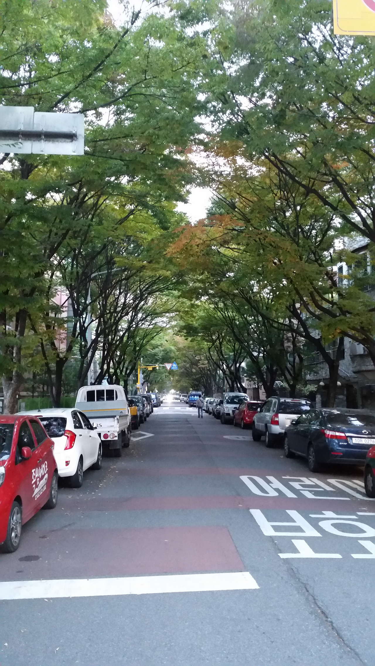부천에 '심원고등학교'라고 있는데 그 근처에 갔다가 찍은 가로수 길 사진. 여름이 이제 그 끝을 보이는 10월에 찍은 사진인데, 아직은 나뭇잎들이 짙은 녹색을 보여주고 있다. 도로 양옆의 가로수 끝부분이 천장 근처에서 서로 닿아 있어 마치 나무 터널 안을 지나가는 느낌이었다. (2016년 10월 사진)