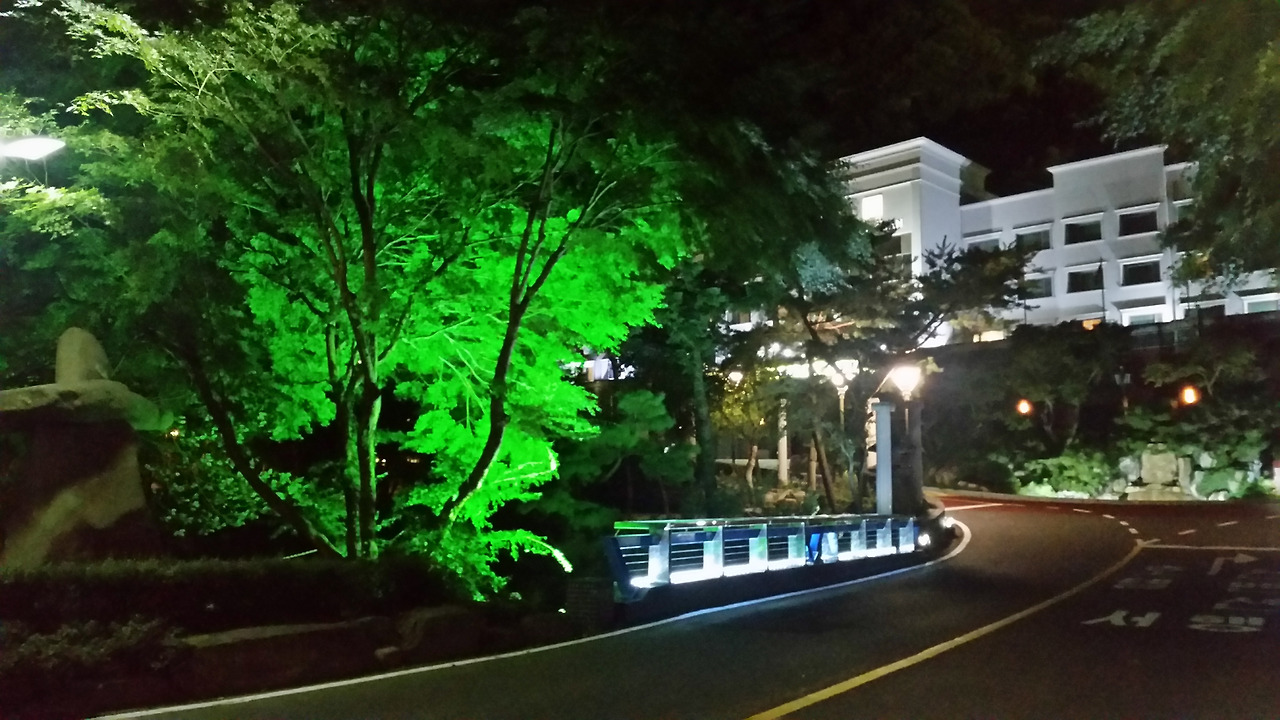 구미 금오산호텔 야경. 과거 구미에 출장 가면 이 호텔에서 숙박하곤 했었다. 하지만 당시에는 아침 출근 시간 이곳에서 공장까지 가는 길이 차가 워낙 심하게 막혀 몇 번 호되게 고생하고는 이후에는 시설은 좀 열악하더라도 공장 바로 옆에 있는 여관에서 숙박했었다. (2017년 9월 사진)