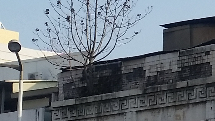 그런데 건물 옥상 부근에 나무가 자라고 있어 화분에 심어 놓은 걸로 생각했는데, 자세히 보니 외벽 틈을 뚫고 나무가 자라고 있었다. 바람에 씨가 날려와 외벽 깨진 틈 사이에 박혀 나무로 성장한 것 같다.
