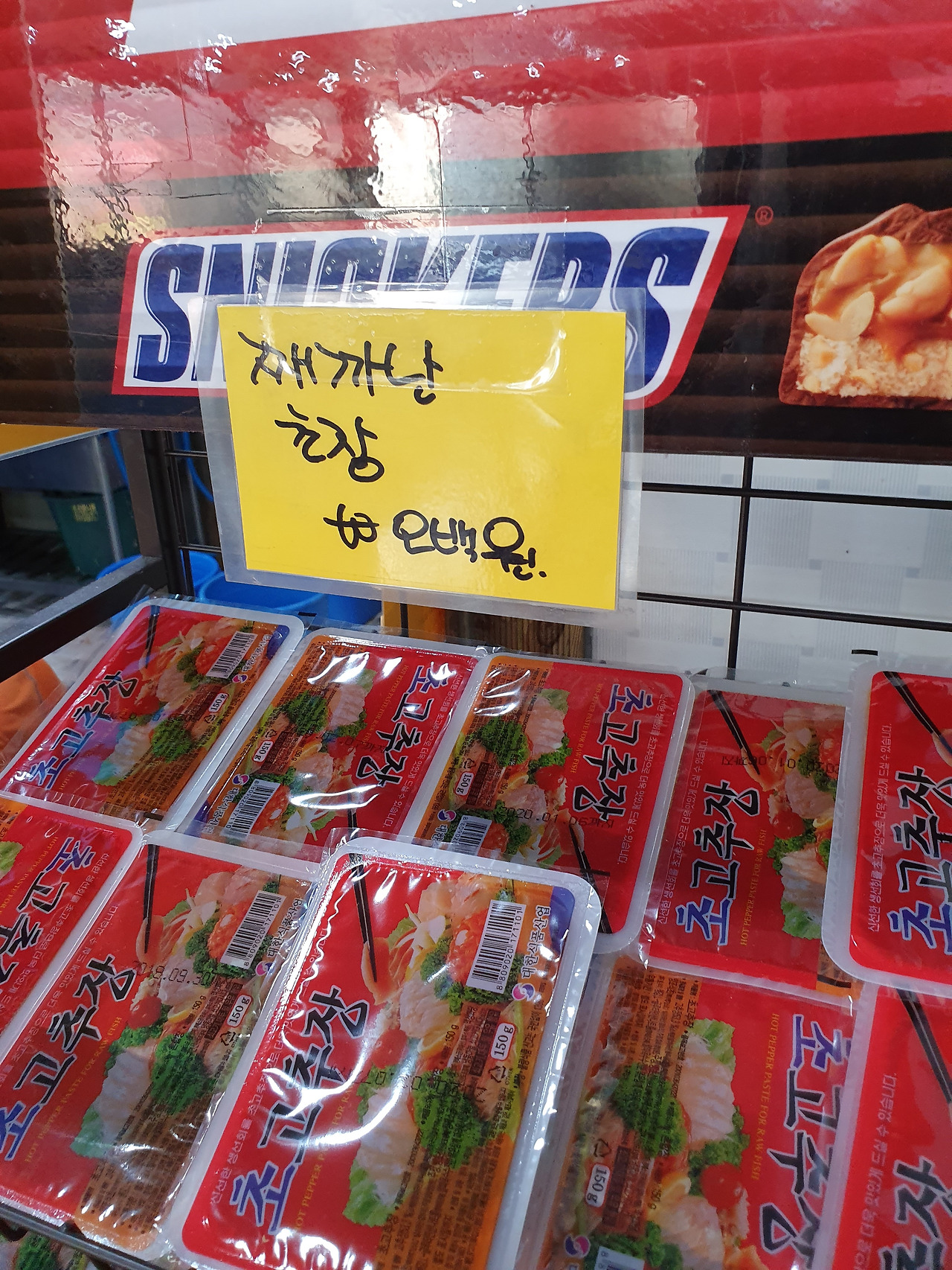구미시내 어느 가게 앞에 적혀 있는 문구. '째까난' 초장을 오백 원에 판다는 문구인데, '째까난'이라는 사투리가 발음 그대로 적혀 있는 것이 재미있다. 하지만 그렇게 어려운 사투리는 아니라 무슨 뜻인지 바로 짐작이 된다. 작은 초장이라는 뜻이다. (2019년 8월 사진)